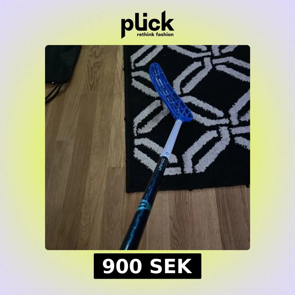 Unihoc innebandyklubba med blå blad och vit grepptejp. Klubbans skaft är svart med tydlig Unihoc-logga. Bladet och greppet ser ut att vara i gott skick, inga synliga sprickor eller större slitage. Perfekt för både träning och match.