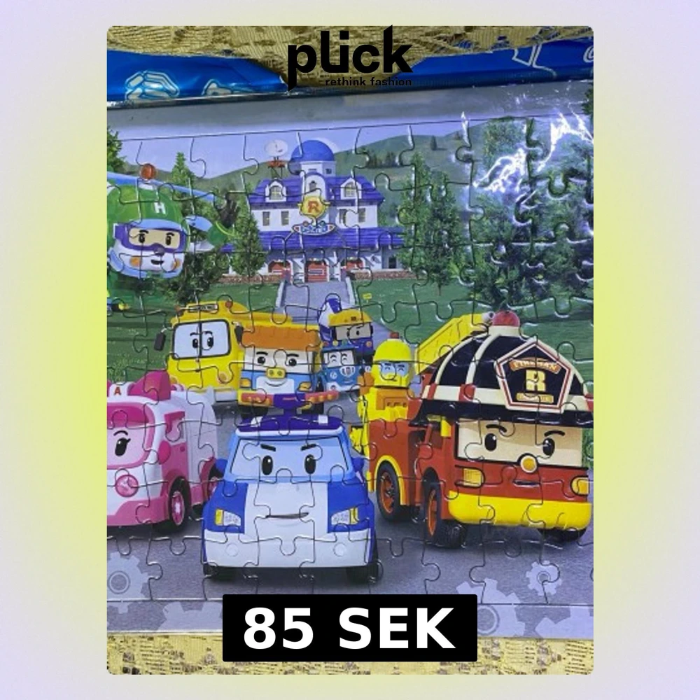 Säljer ett färgglatt pussel med motiv från barnserien Robocar Poli. Pusslet visar flera tecknade räddningsfordon som polisbil, brandbil, ambulans och helikopter i olika färger som blå, röd, gul, grön och rosa. Perfekt för dig som gillar fordon och pussel! 85kr/st