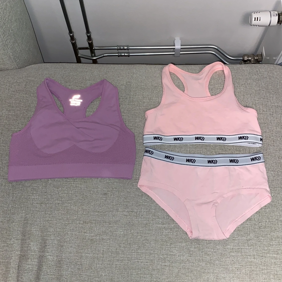 Badshorts säljs för 30kr, storlek 34 och har använts några gånger. Träningströja säljs för 40kr i storleken XS (barnstorlek), nyskick. Underkläders set för 50kr, storlek 146-152, nyskick. Lila topp i storleken 158/164 säljs för 20kr, använt ett par gånger