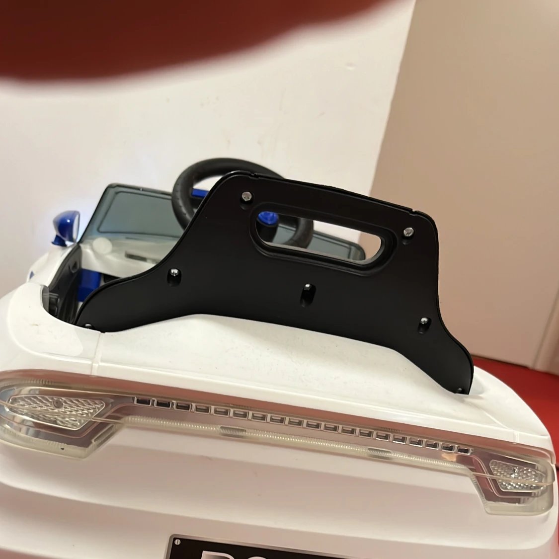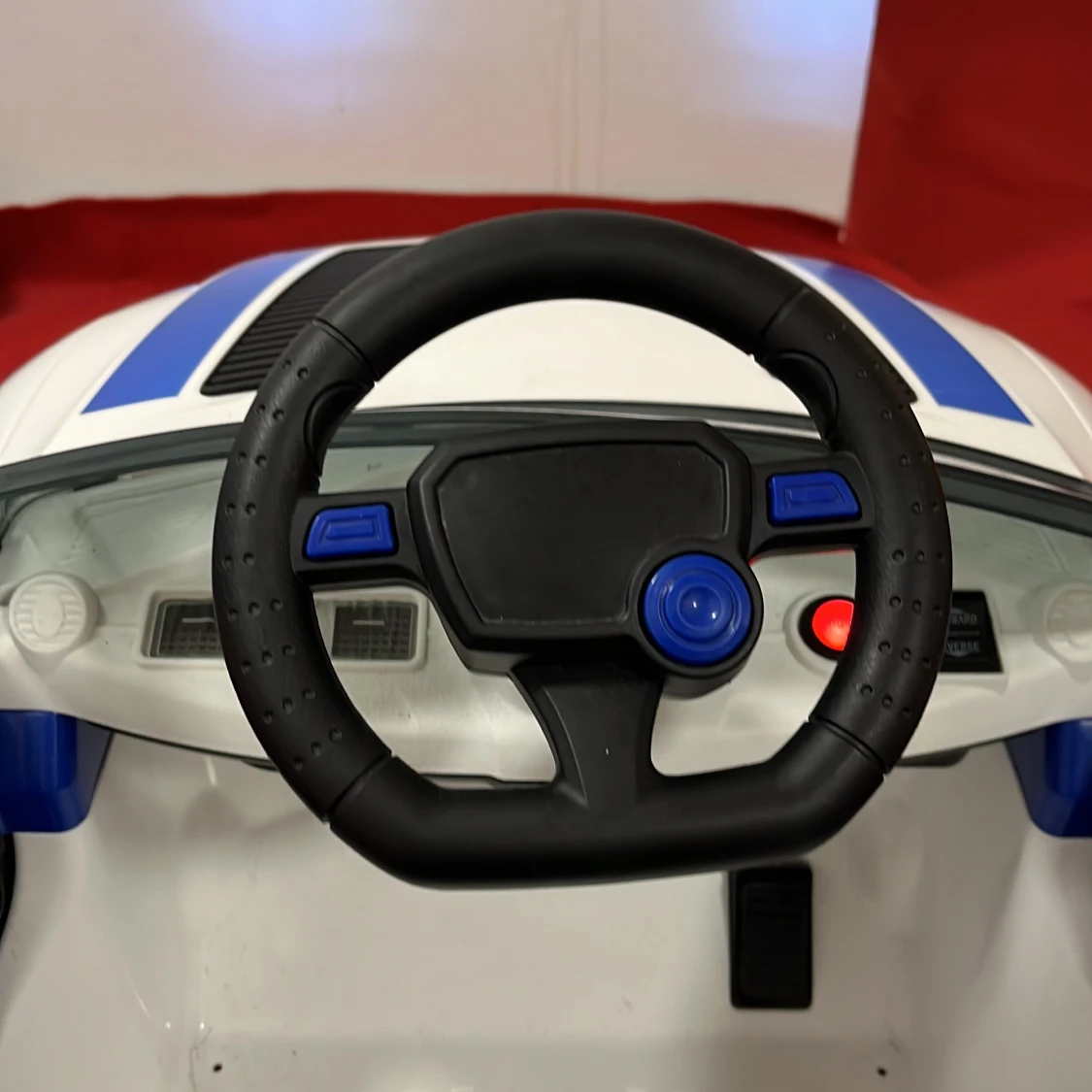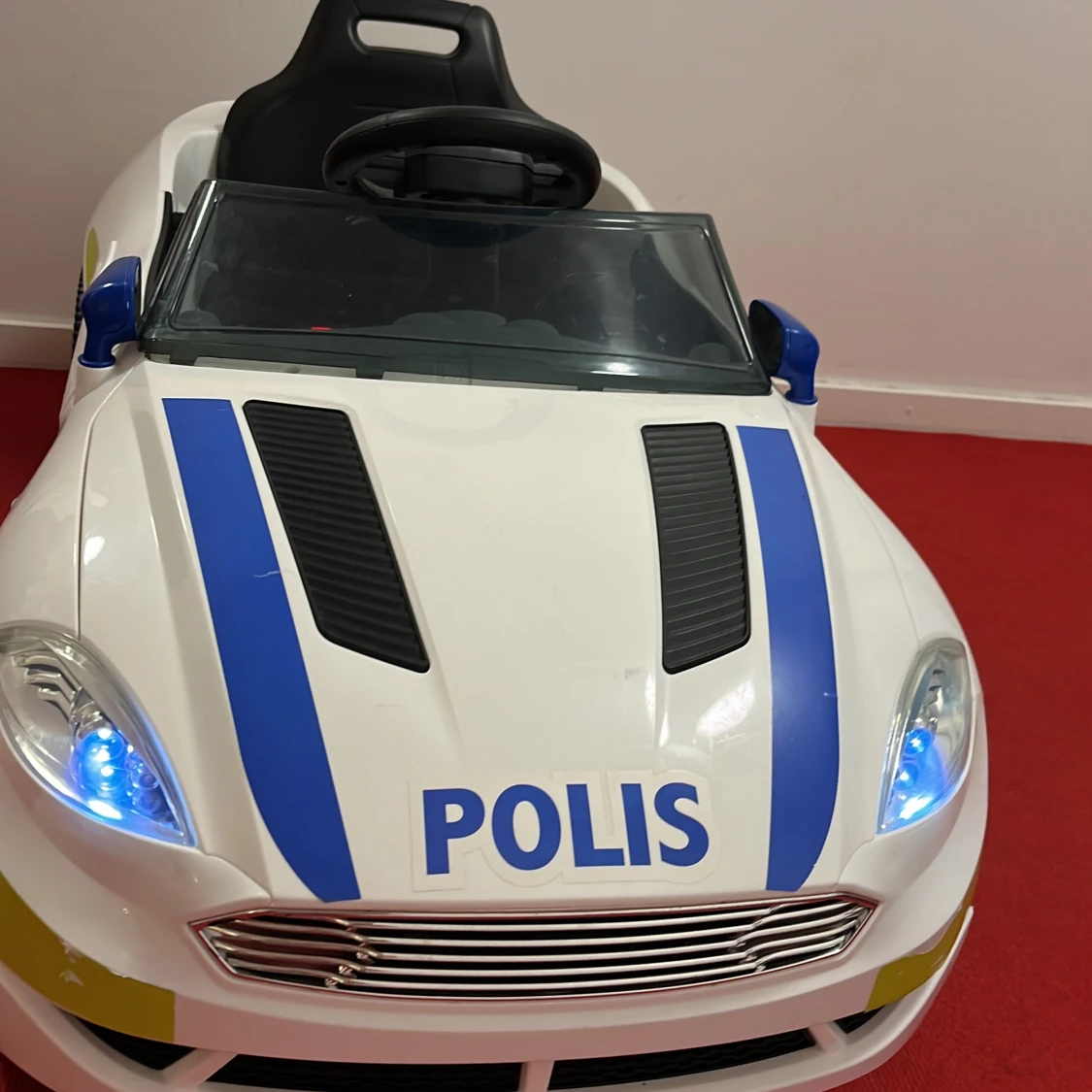 Hej den är en polis bil den fungerar jätte bra inget är sönder den har en belte som barnen kan sitta i dörren den öppnas och det fungerar från 2-6 år gammal vi har använt den några gånger den kan göra ljud asså den har musik och lappar fungerar.