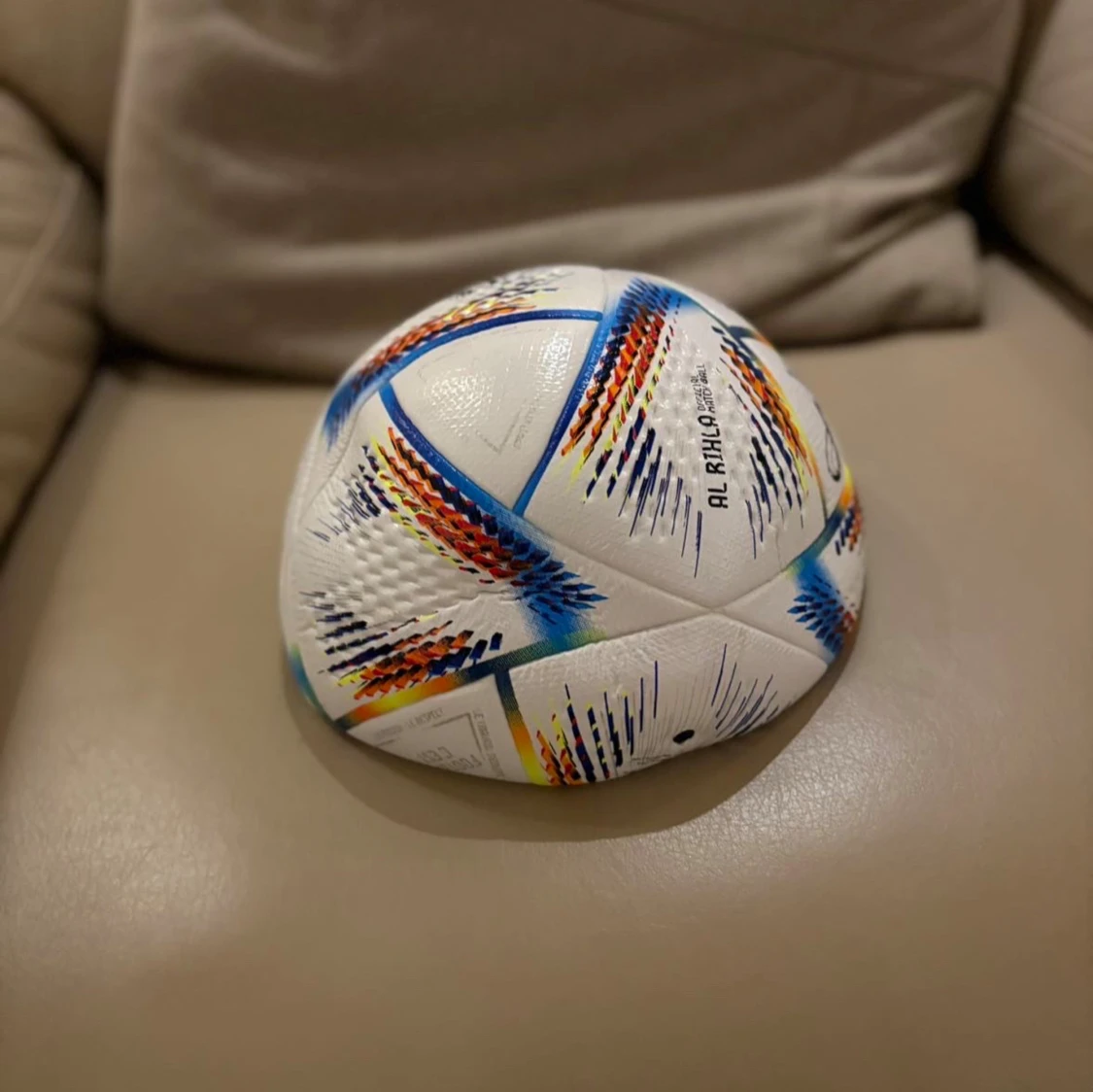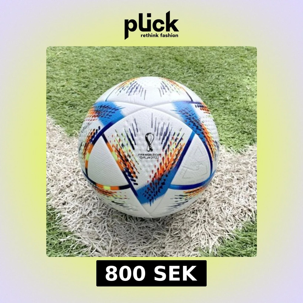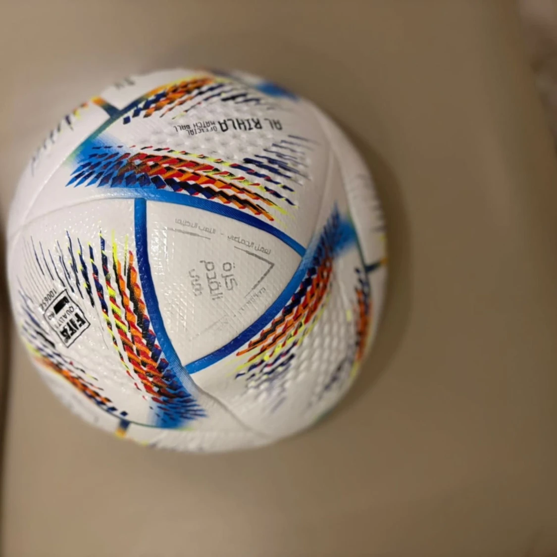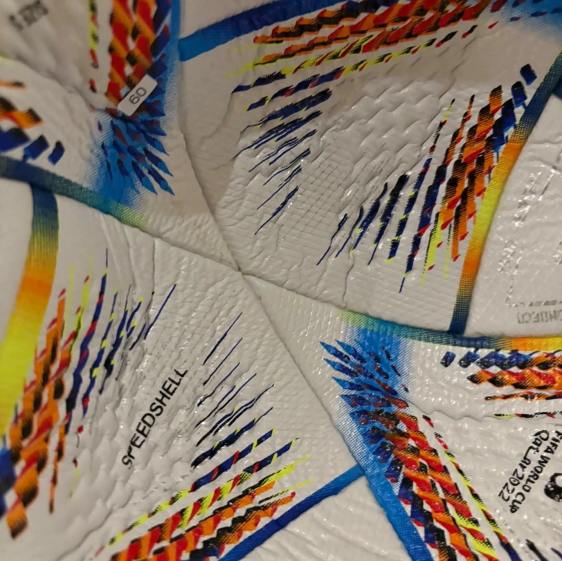 Säljer en officiell Adidas Al Rihla fotboll från VM 2022 i Qatar. Bollen är vit med färgstarka detaljer i blått, rött, orange och gult samt svarta inslag. Tillverkad i syntetmaterial med texturerad yta och modern grafik. Perfekt för matcher och träning.