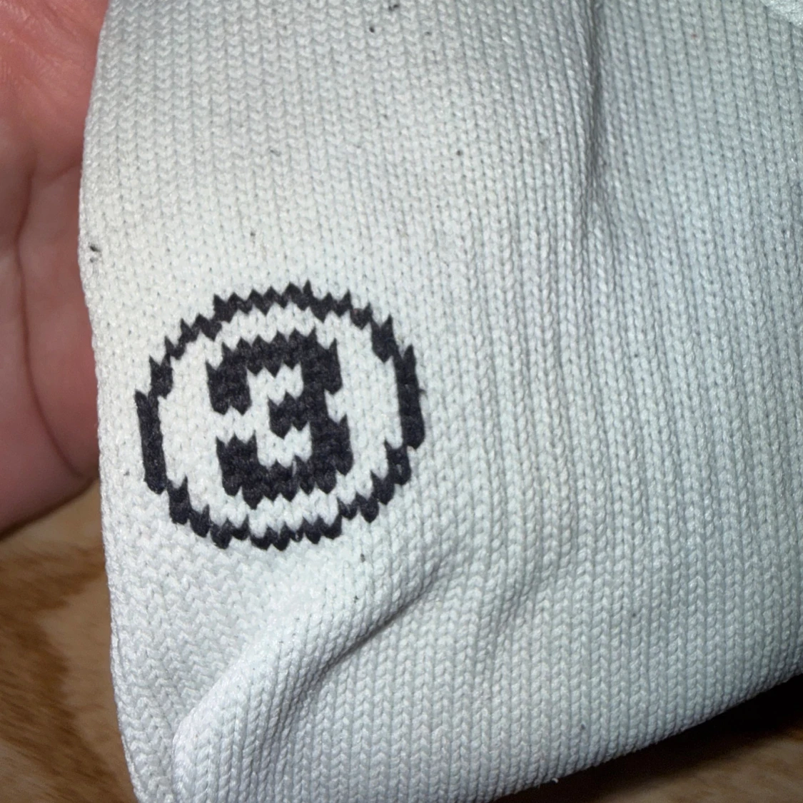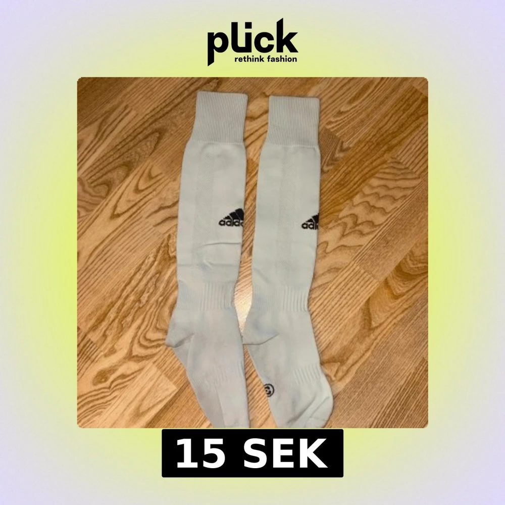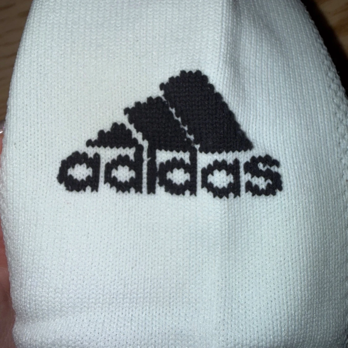Säljer ett par vita fotbollsstrumpor från Adidas med svart logga. Perfekta för fotboll eller träning, med ribbade muddar upptill för extra komfort. Storlek 3.