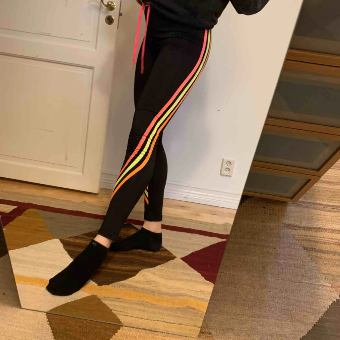 Snygga träningstights med neon stripes på sidan. Tre tänder i neon färger. Sitter snyggt och anpassar sig efter personlig passform. Fler bilder kan skickas. Frakt ingår ej.