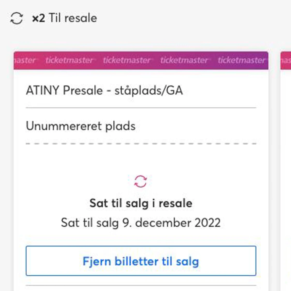 2 ATINY-presale ståplatser. Säljes pga köpte andra biljetter. Båda Köptes för 2 580,70 SEK. Säljes för samma pris, men kan diskuteras. Säljes även på Ticketmaster re-sale (men dyrare där pga ticketmasters service avgift). PM för mer information.