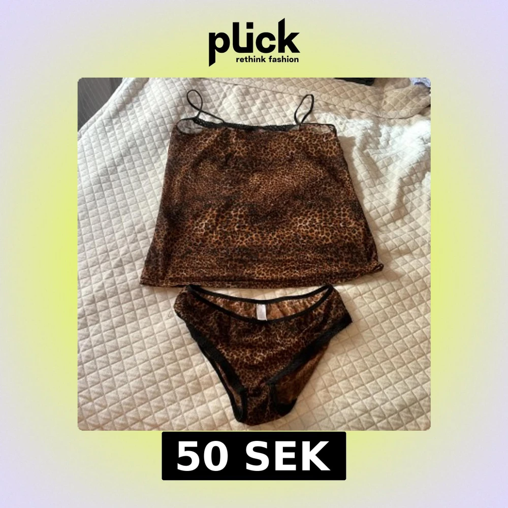 Säljer ett leopardmönstrat pyjamas set från Åhléns i storlek S. Toppen har tunna svarta axelband och svart spetsdetalj längs halsringningen. Materialet är lätt och transparent.
