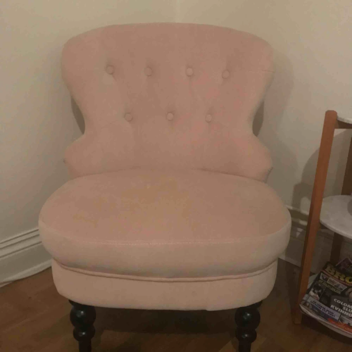 Ljusrosa fåtölj. Nyskick. Inköpt på Åhléns Finns i Vasastan, Stockholm