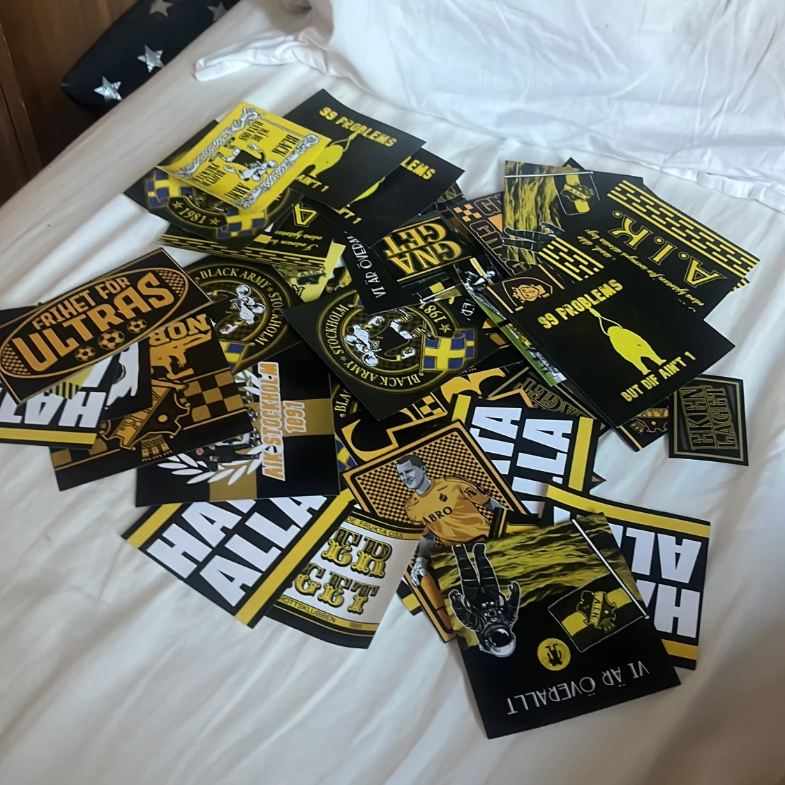 Samling med AIK Black Army-klistermärken i svart och gult, perfekt för dig som älskar fotboll, supporter-kultur och vill visa ditt stöd för AIK. Fylld med coola motiv, slogans och klubbkänsla – perfekt för unga fans och samlare!
