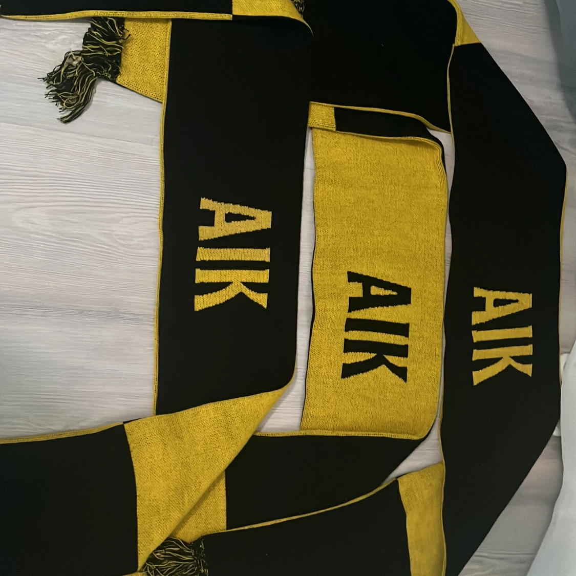 Säljer alla 3 för 250 Snygg halsduk i AIK:s klassiska färger svart och gult med tydlig AIK-logga på båda sidor. Halsduken har fransar i ändarna och är perfekt för att visa ditt stöd på matchen. Tjockt och mjukt material som håller dig varm på läktaren.