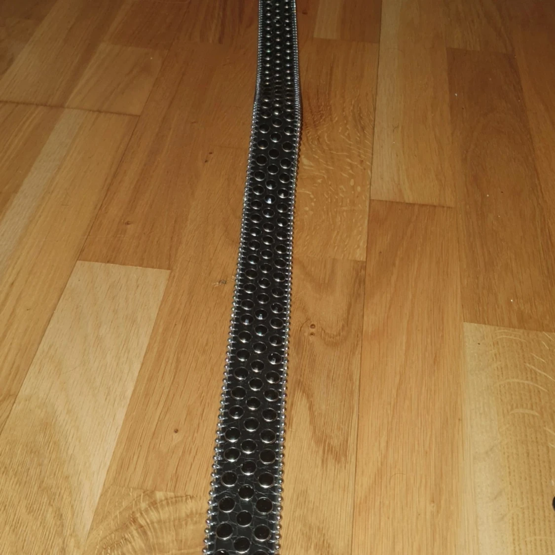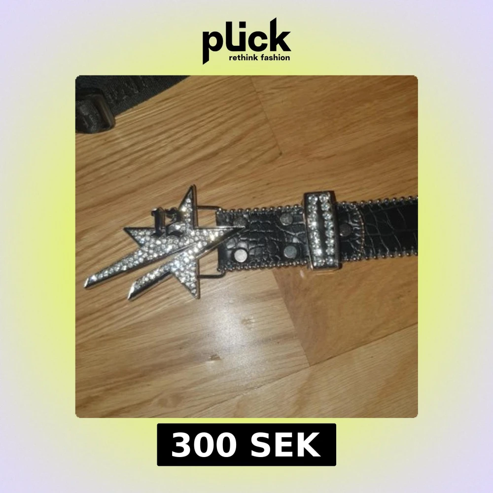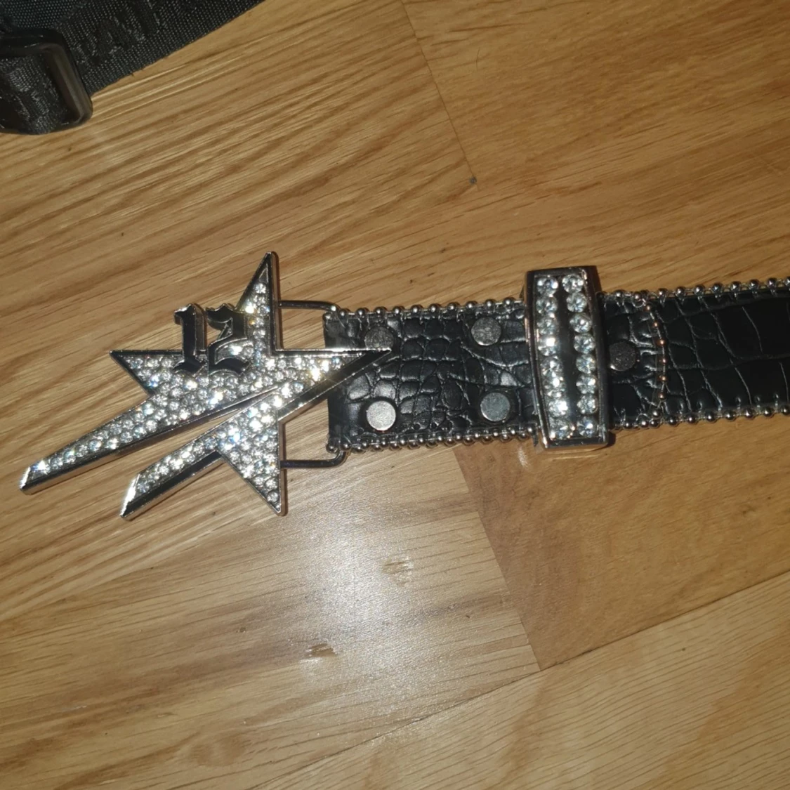 Coolt svart bälte med glittrande stjärnformad spänne och nitar längs hela remmen. Perfekt för att ge en edgy touch till din outfit.