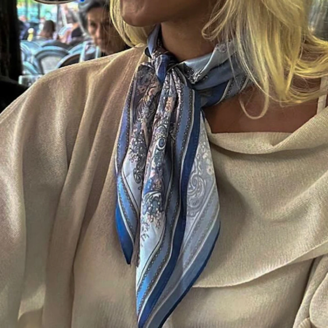 Snygg sidenscarf med blommigt mönster i blått, vitt och grått. Scarfen har en kvadratisk form och kan stylas runt halsen eller på väskan. Detaljerade blommor och paisley-inspirerade inslag ger en lyxig och trendig vibe. Perfekt accessoar för att lyfta din outfit.