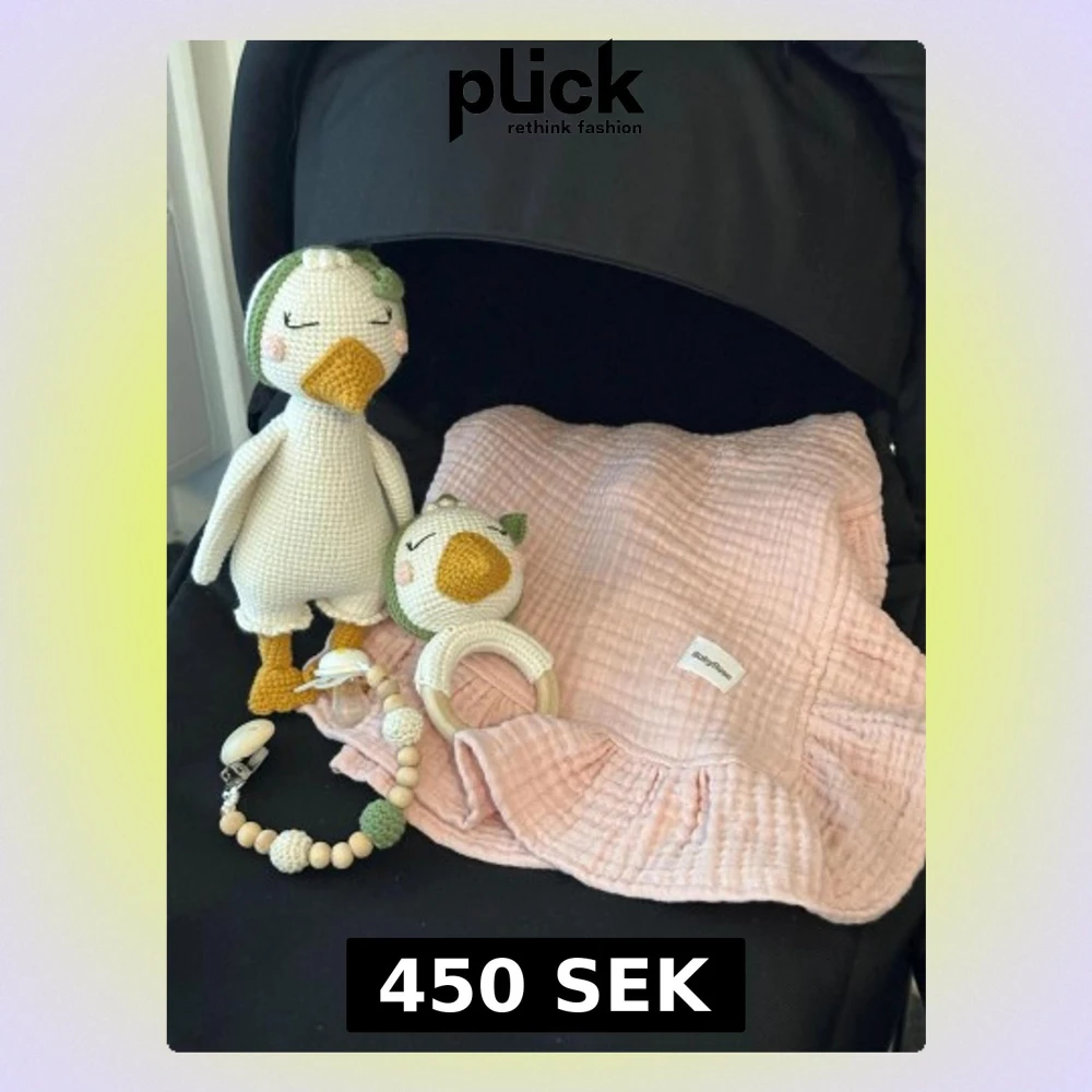 – Virkad med bomullsgarn – 22 cm napphållare, träclips & silikonring – Längs varierar beroende på gosedjur, ca 25-35cm – Produkterna är gjord med certifierade material