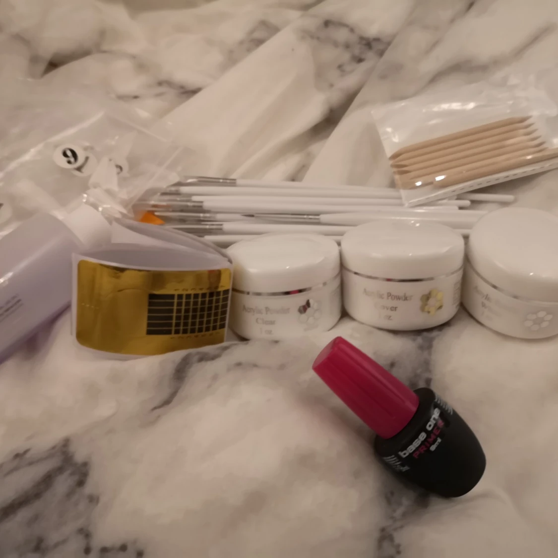 3 akrylpulver, clear cover och White. Har använt lite av White dock bara en test gång! Lite penslar (oanvända) 1 primer Nageltippar (stiletto) i många olika storlekar 1 liquidflaska som det är ca halva kvar av 7 "klisterformar" *kan skickas mot frakt*