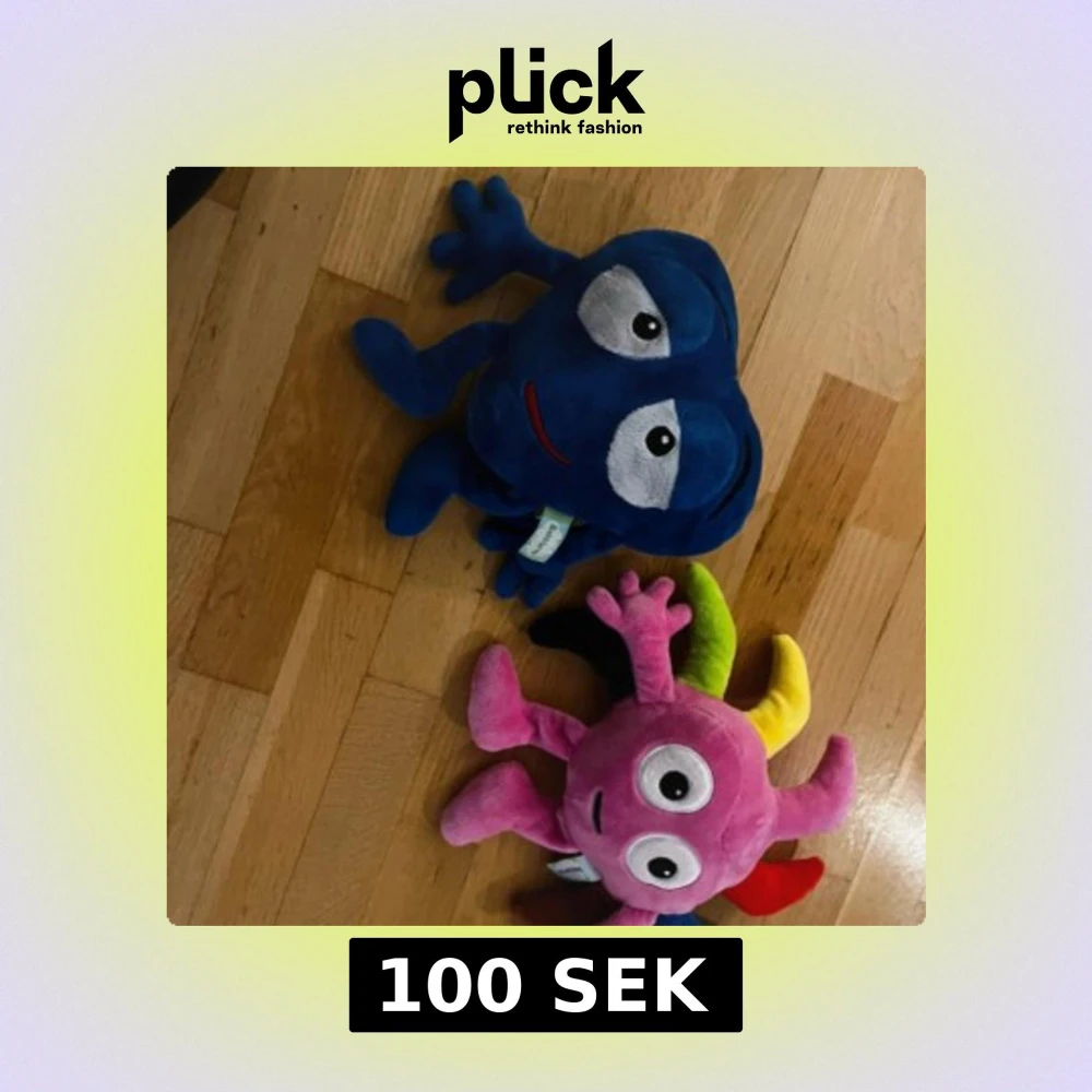 Två mjukisdjur i form av fantasifigurer. Den ena är blå med stora vita ögon och den andra är rosa med flerfärgade armar i grönt, gult och rött. Perfekta som lekfulla dekorationer eller kramgoa vänner för barn. 100kr st