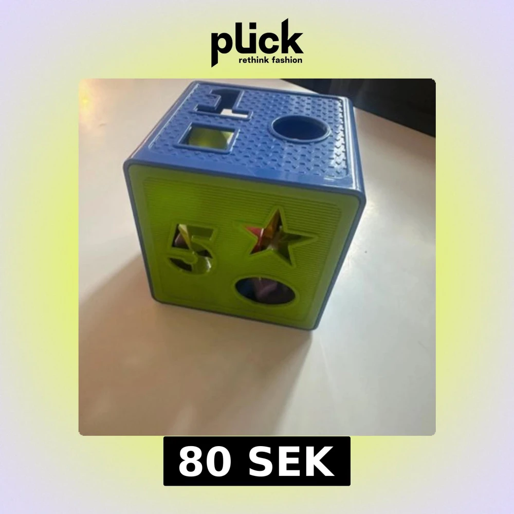 Bilden visar en färgglad formsorterare i plast, avsedd för små barn. Produkten har olika former och siffror på sidorna där barn kan stoppa in matchande klossar. Inga synliga defekter eller slitage, ser ut att vara i gott skick. Perfekt för att utveckla motorik och igenkänning av former.