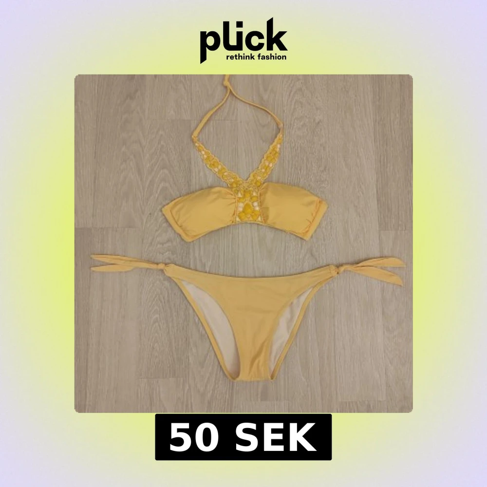Jättesöt gul bikini med broderade pärlor på överdelen och knyt i nacken samt knytning på sidorna av underdelen. Perfekt för stranddagar och sommarens bad. Väldigt bra skick.