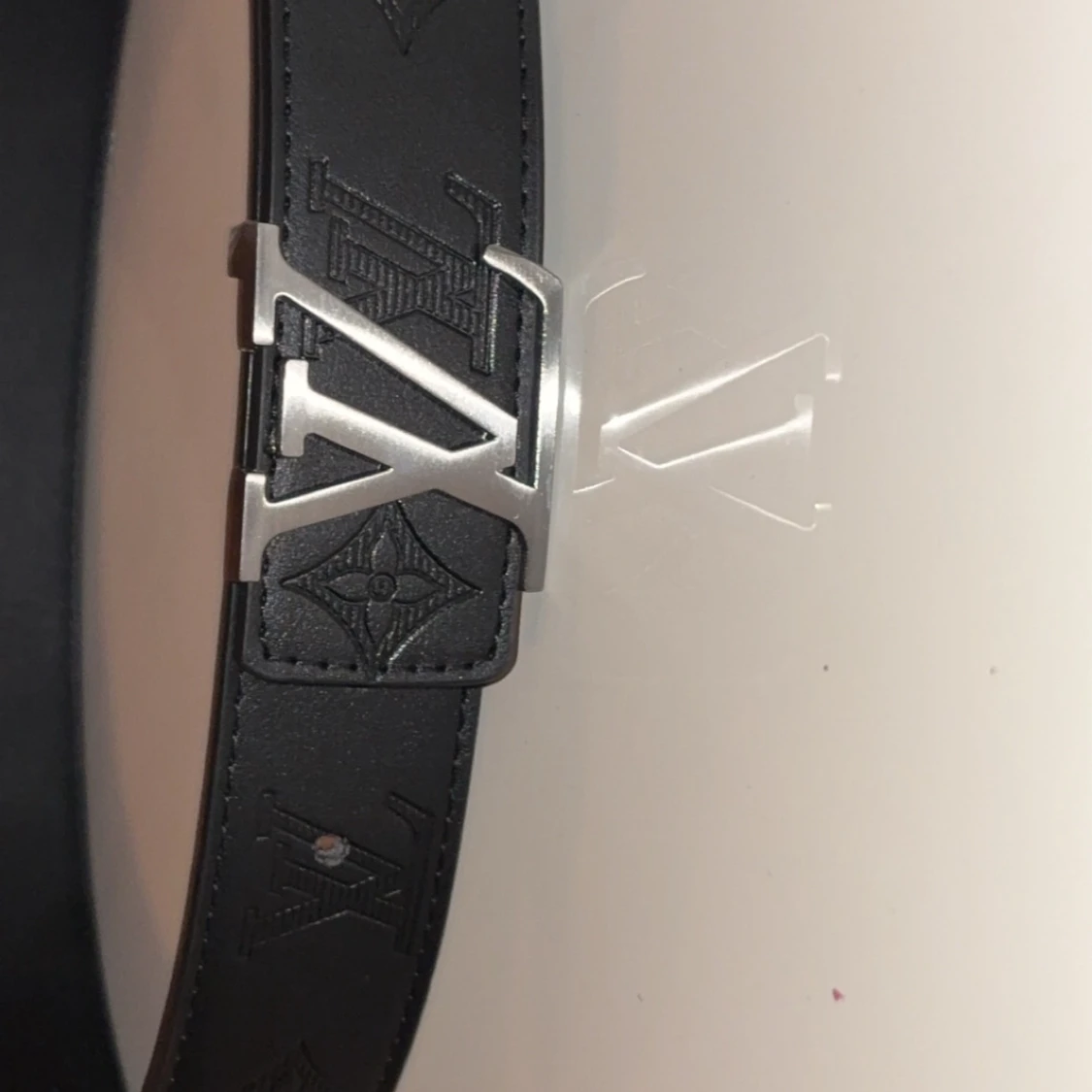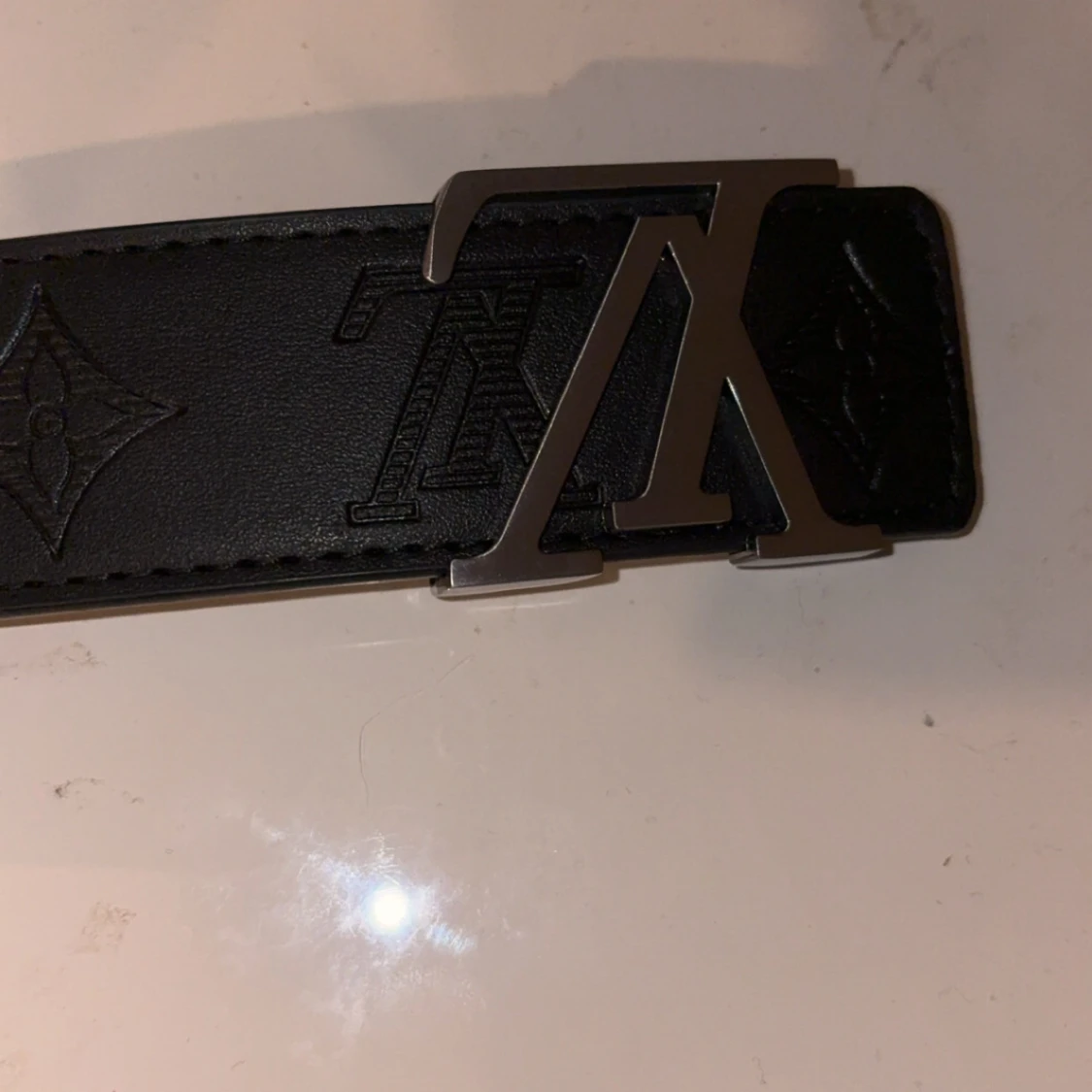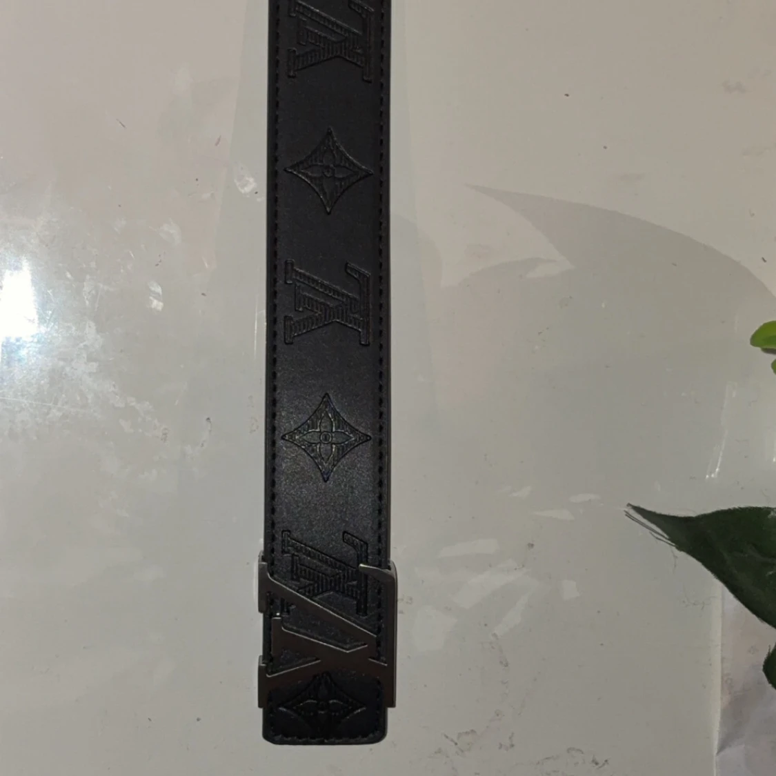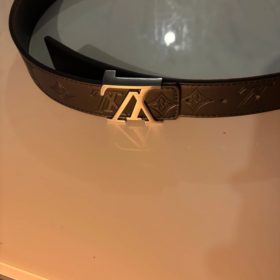 Snyggt svart bälte skinn med klassiskt monogram präglat längs hela remmen. Bältet har en stilren, silverfärgad som ger en lyxig känsla. Perfekt accessoar för att lyfta din outfit med en exklusiv touch.