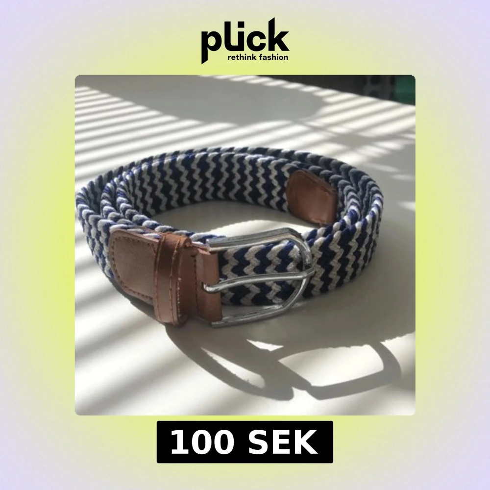 Snyggt randigt bälte i blått och vitt med bruna läderdetaljer. Bältet har en klassisk metallspänne och är perfekt för att ge en stilren touch till din outfit.