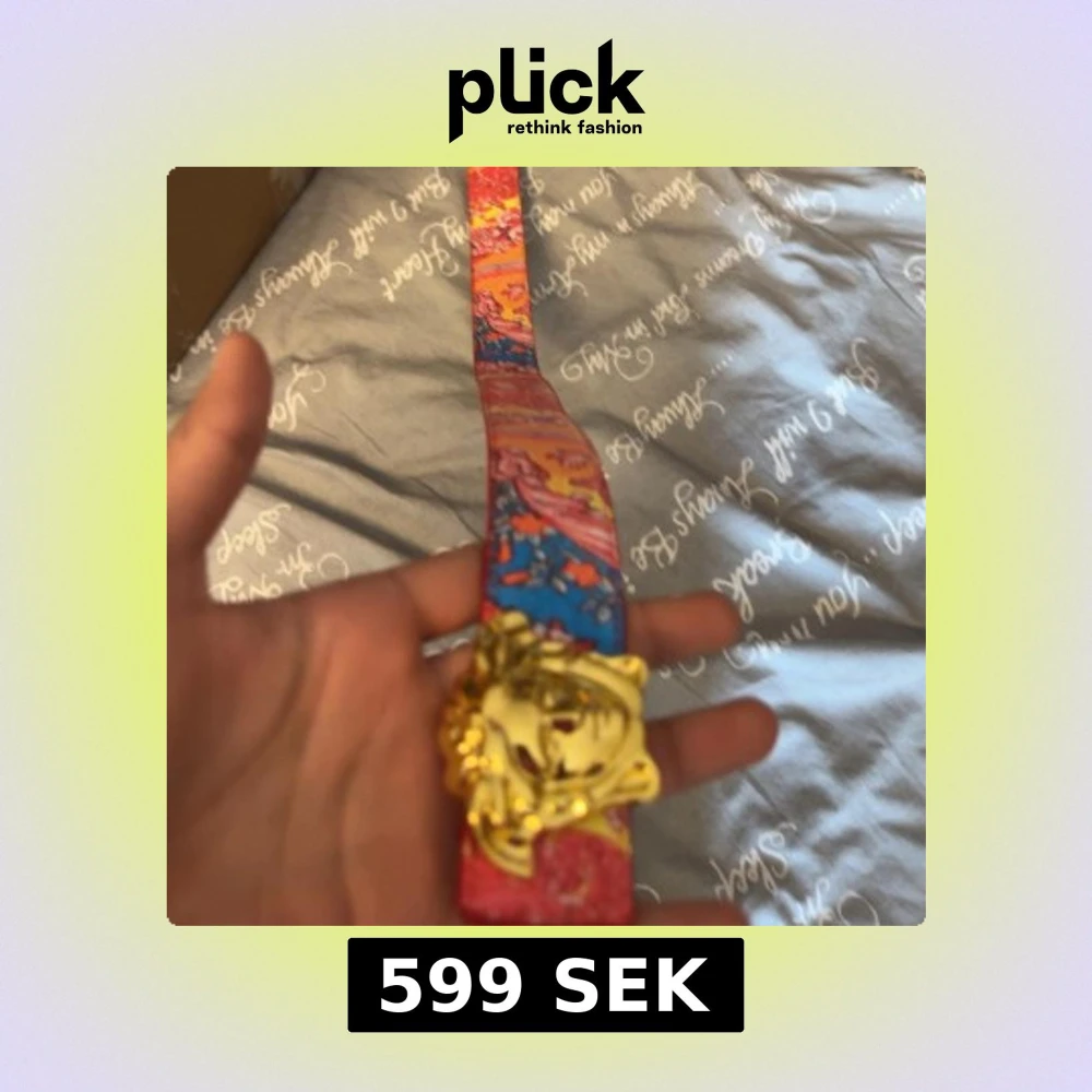 Säljer ett unikt bälte med färgglatt mönster i rött, blått och orange samt ett stort guldfärgat lejonspänne. Bältet har en konstnärlig design och insidan är ljusbeige. Perfekt för dig som vill sticka ut med accessoarer.