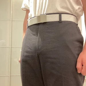 Vitt bälte med metallklasp, 125 cm långt. Jag har 89 cm i midjemått och bältet passar bra.