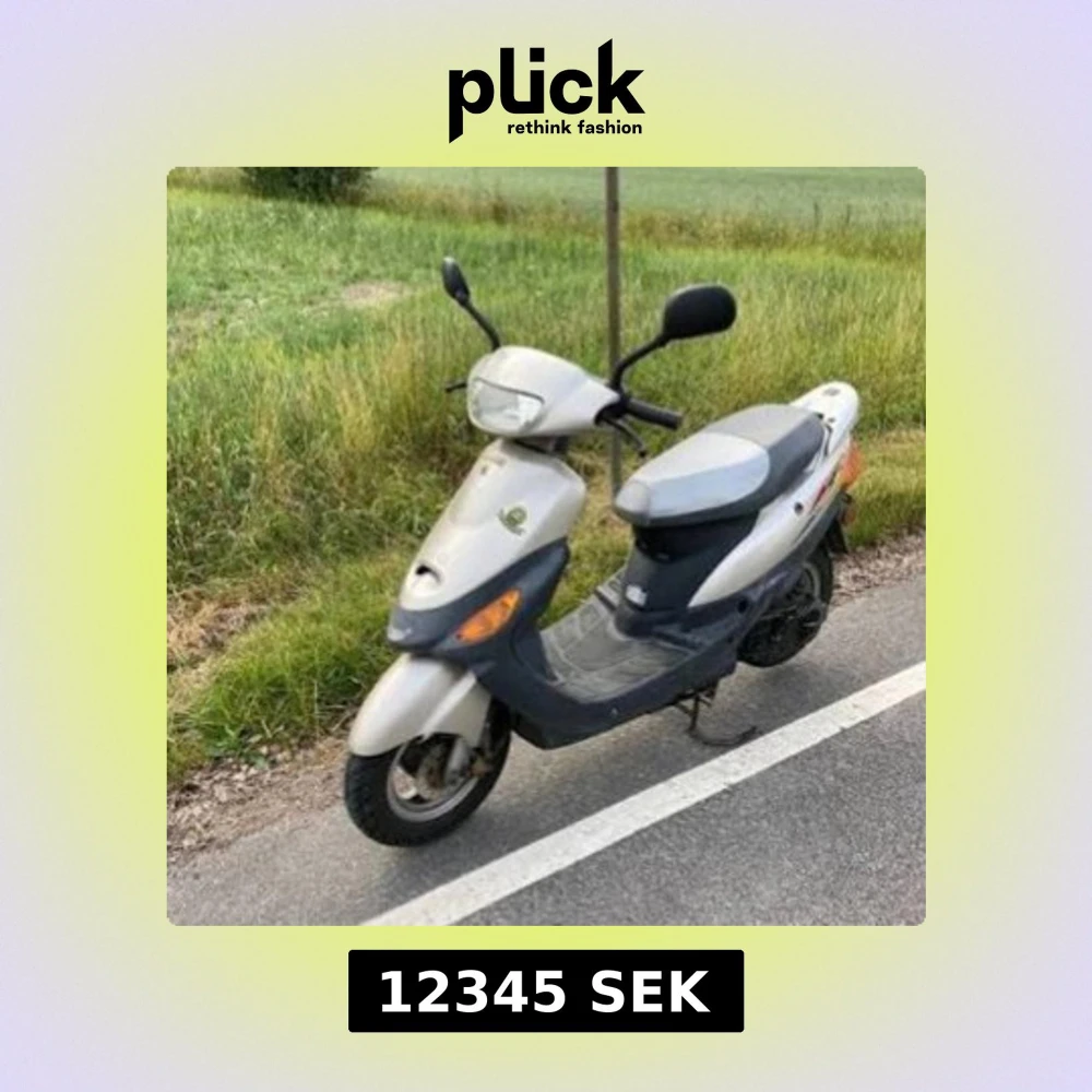 Bilden visar en grå moped/scooter parkerad vid vägkanten. Mopeden ser ut att vara i bruksskick med synligt slitage på fotplattan och vissa repor på kåporna. Inga uppenbara defekter syns, men produkten är inte elektronik och matchar inte någon av de angivna taxonomierna.