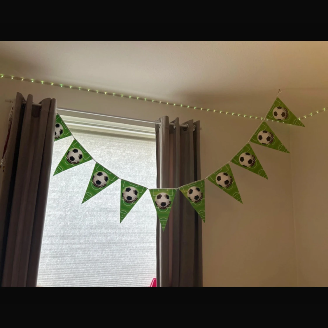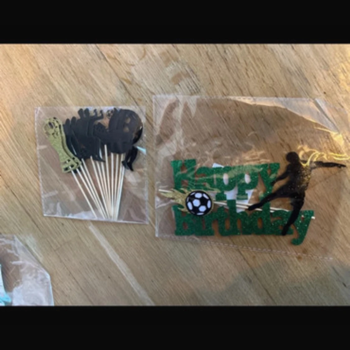 Komplett set med fotbollstema födelsedagsdekorationer: två gröna vimplar (en med 'Happy Birthday', en med fotbollar) samt tårtdekorationer med fotbollsmotiv. Allt i fint skick, perfekt för barnkalas eller fotbollsfest.