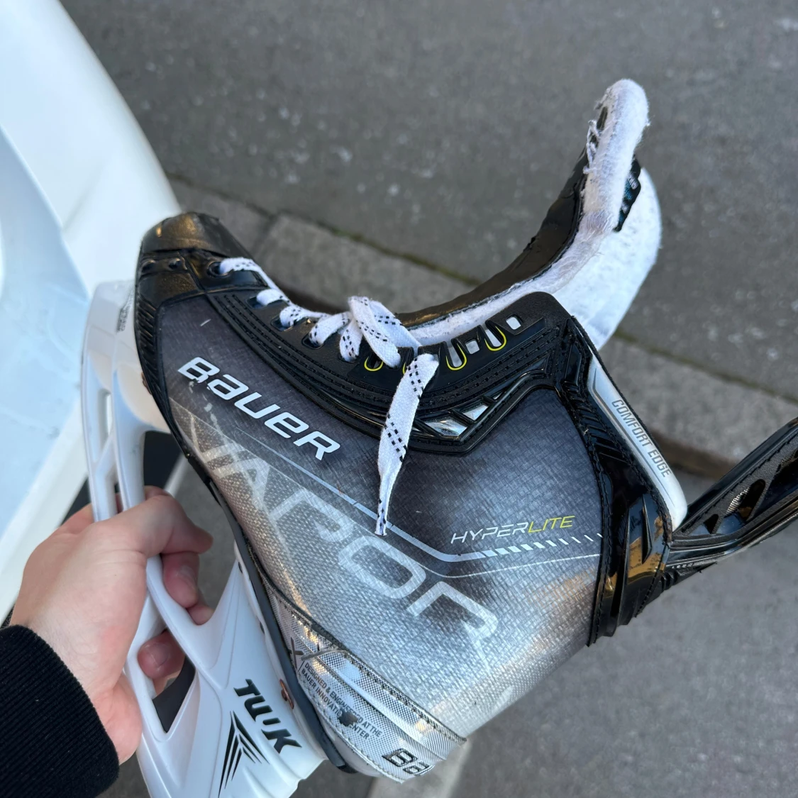 Säljer ett par Bauer Vapor Hyperlite X hockeyskridskor i svart, silver och vit. Skridskorna har snörning och är designade för maximal prestanda på isen. Perfekta för dig som vill ha snabba och lätta skridskor med grym passform.