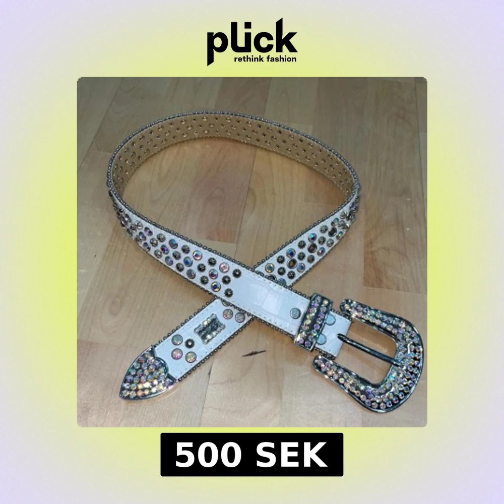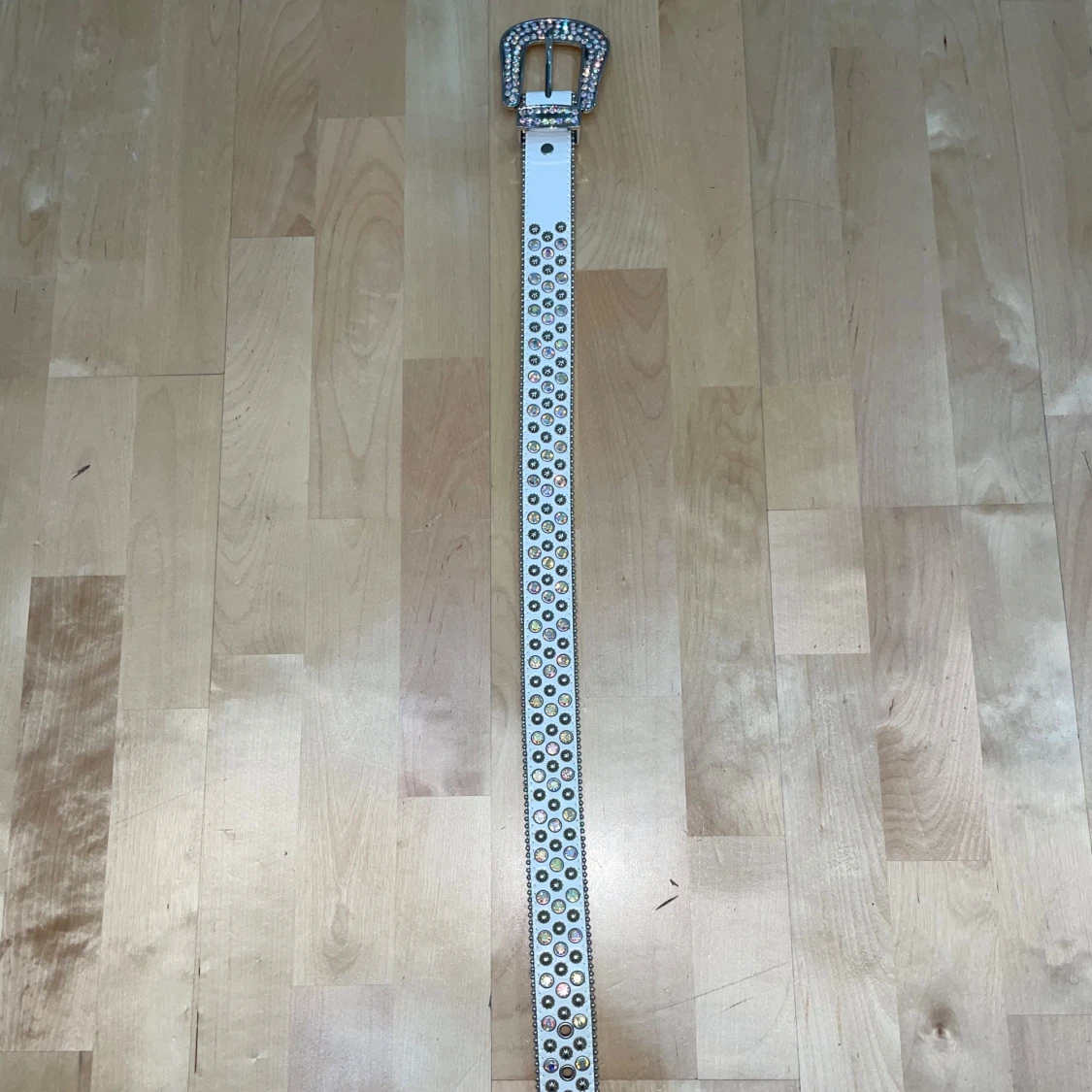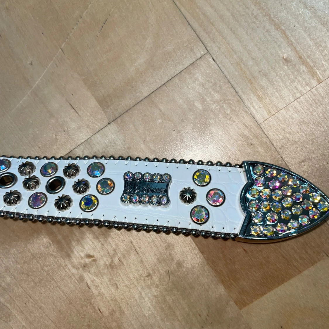 Snyggt vitt bälte med massor av glittrande rhinestone-stenar och silvriga nitar längs hela bandet. Spännet är dekorerat med stora stenar som verkligen poppar. Perfekt accessoar för att sticka ut och ge outfiten extra edge.