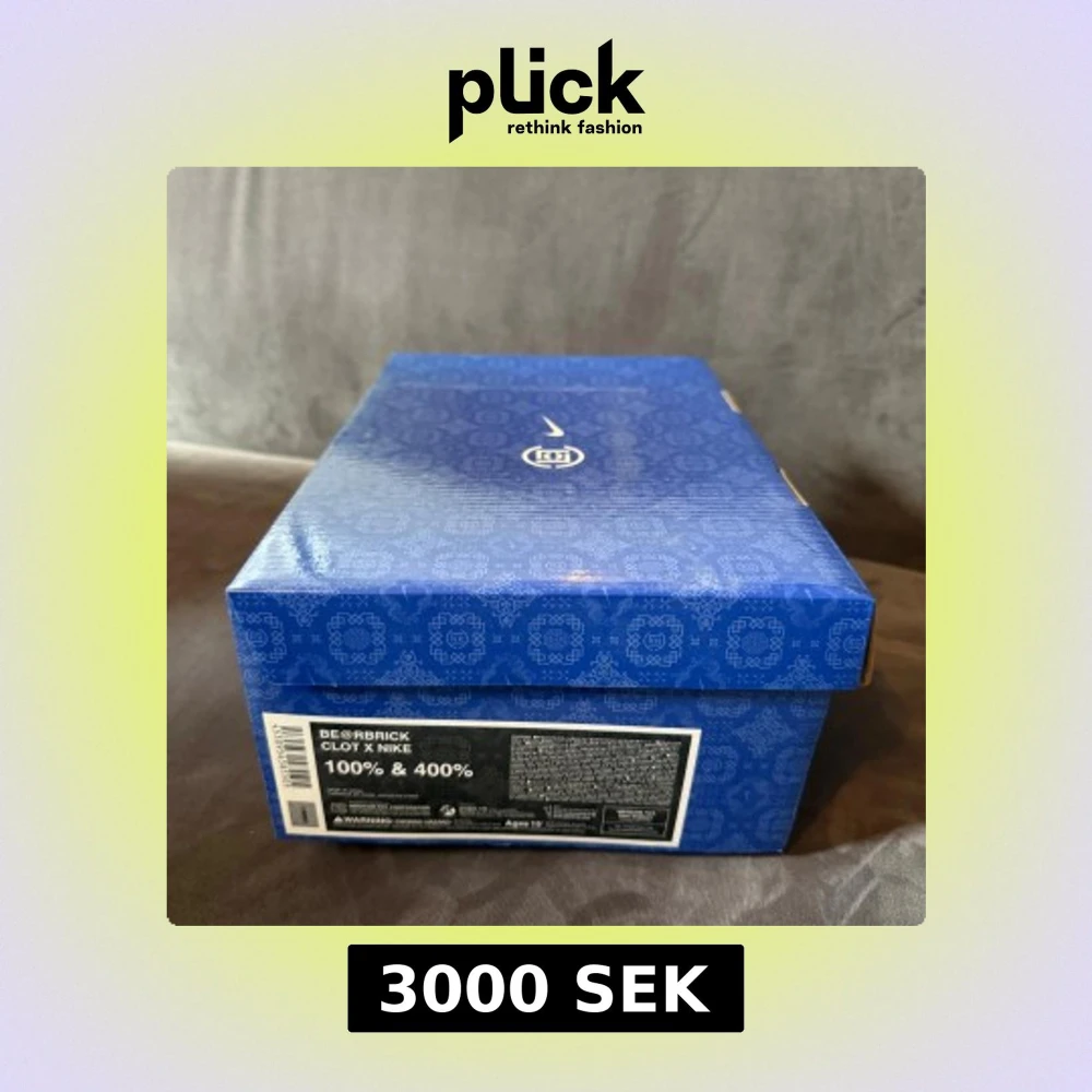 Bilderna visar en samlarleksak från BE@RBRICK CLOT x Nike, med två figurer i en snygg blå box. Det är ingen bok, utan en designad figur som passar perfekt för dig som gillar streetwear, konst och unika samlarobjekt. Perfekt för att ge din hylla eller skrivbord en cool vibe.
