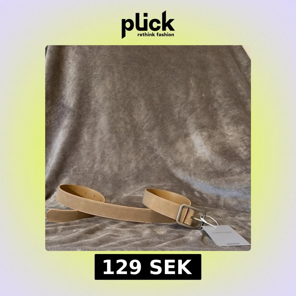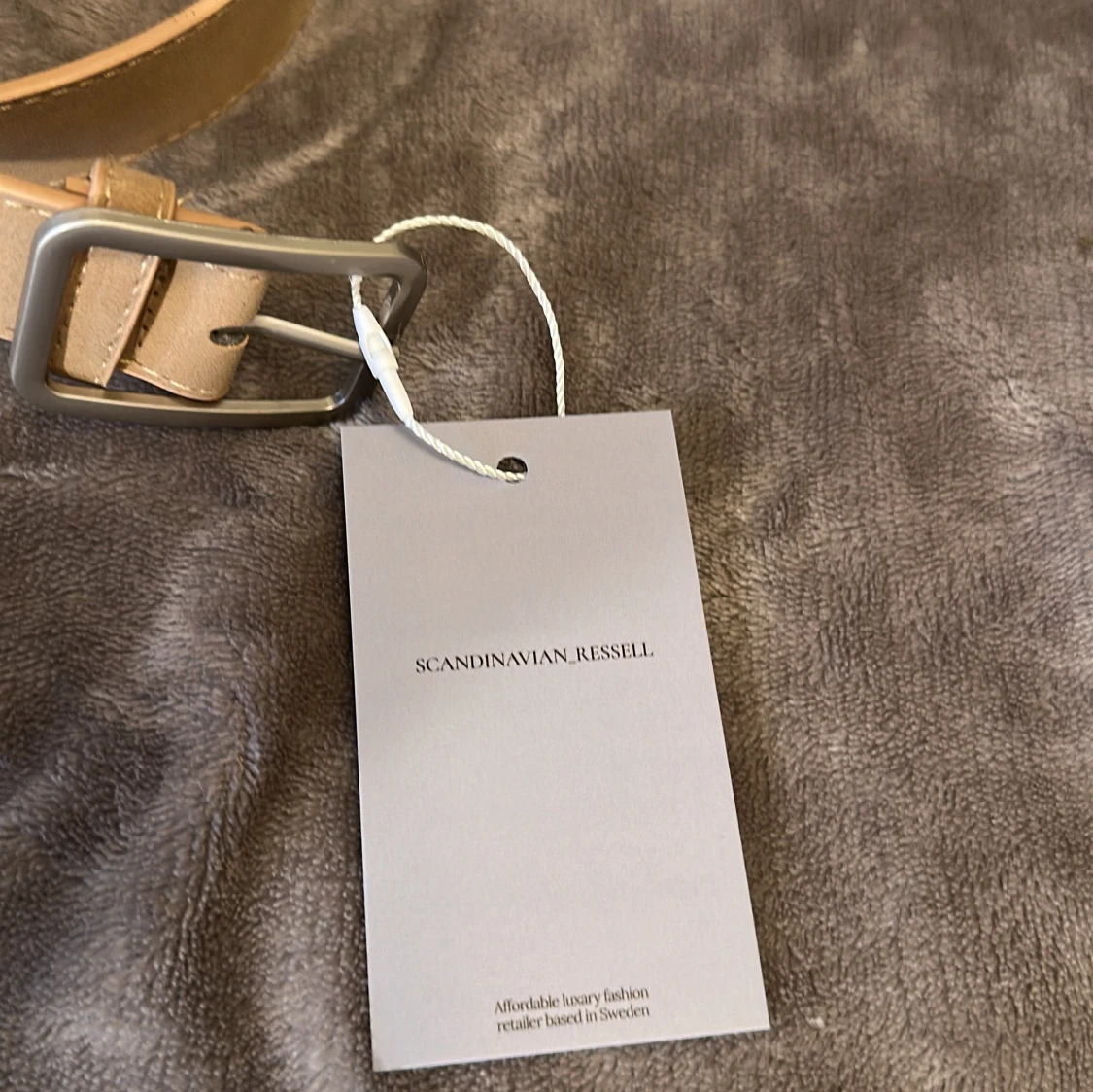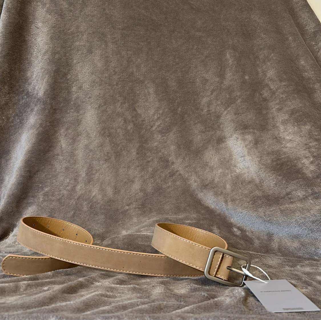 Stilrent beiget bälte med matt silverfärgat spänne. Bältet har en klassisk, rak form och är gjort i skinn med ljusbrun insida. Perfekt accessoar för att lyfta din outfit. 100cm