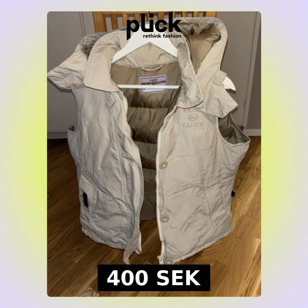 Snygg beige dunväst från Henri Lloyd med huva och dragkedja samt knappar framtill. Västen har broderad logga på bröstet och en cool detalj med brittisk flagga på sidan. Fodret är i en matchande beige ton och materialet känns slitstarkt och mjukt.