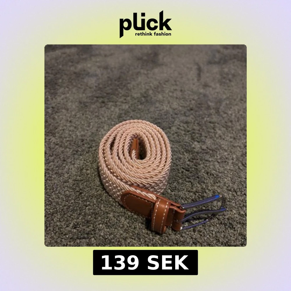 Snyggt beige flätat bälte med bruna skinnliknande detaljer och silverfärgat spänne. Perfekt för att ge en stilren touch till din outfit. Längden är 105cm