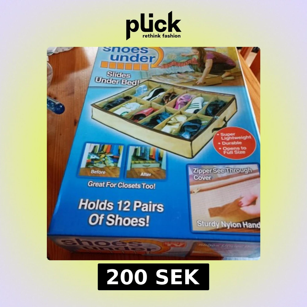 Praktisk beige förvaringsväska från Shoes Under som rymmer 12 par skor. Väskan har genomskinligt lock med dragkedja och är tillverkad i lätt och slitstark nylon. Perfekt att skjuta in under sängen eller ha i garderoben för att hålla ordning på skorna. 15 cm hög.
