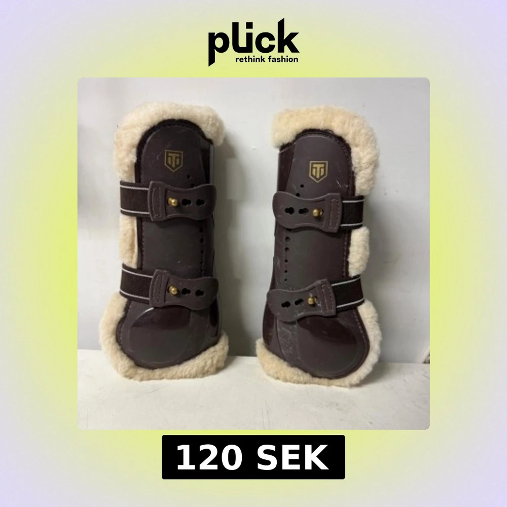 Bilderna visar ett par hästbenskydd med fårskinnsfoder och bruna plastskal.