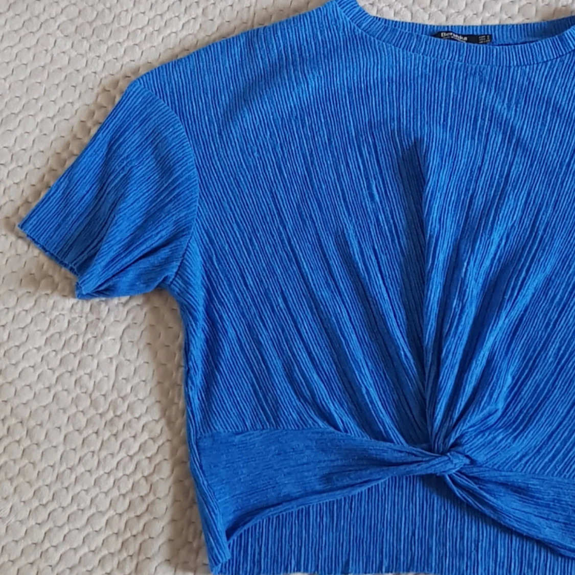 Cropped blå tröja i crepematerial med knutdetalj Köparen betalar frakten