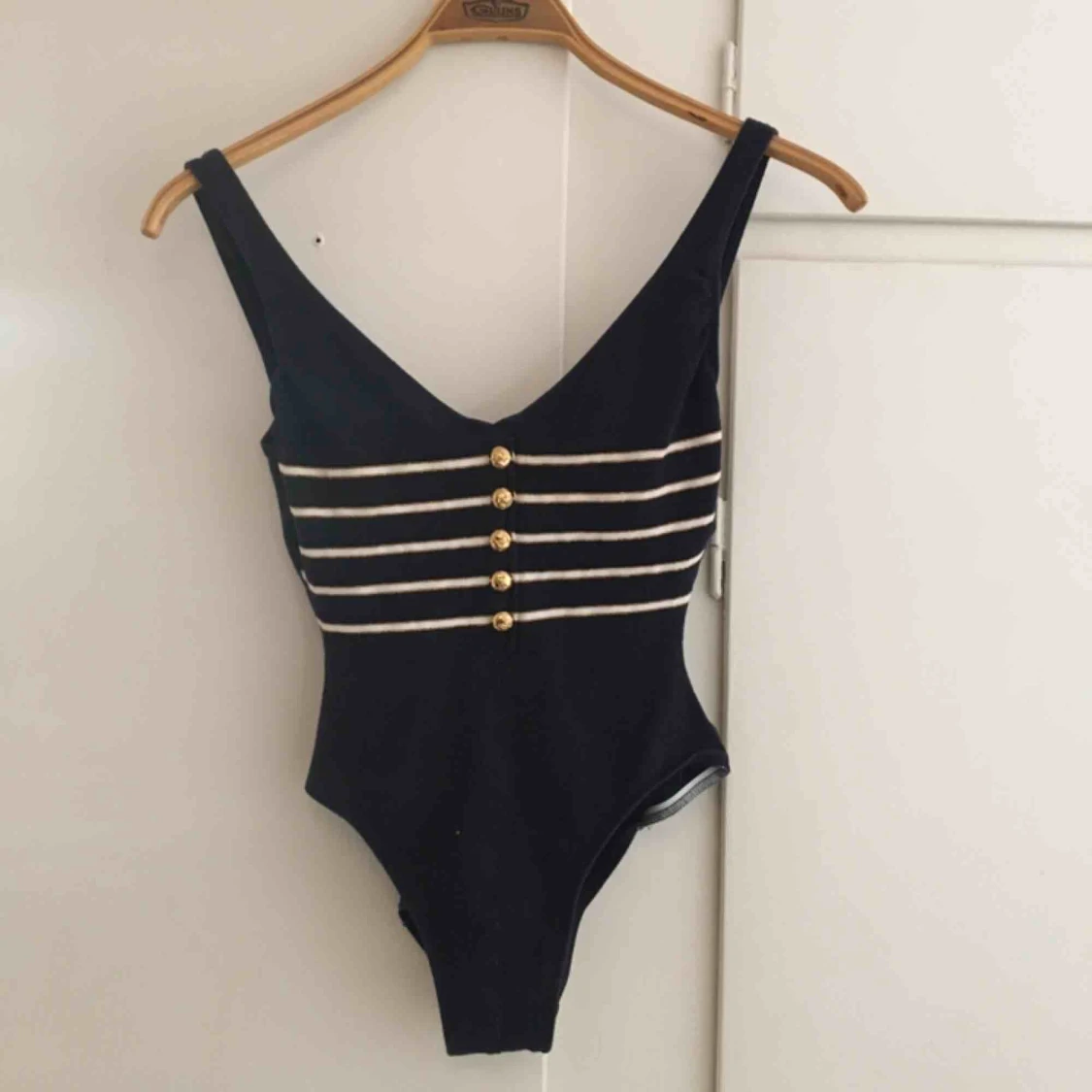 Vintage baddräkt/ body (är i bomullsliknande material) i sailor- stuk med blåvita ränder och fina guldknappar med ankare på ⚓️ från beyond retro.