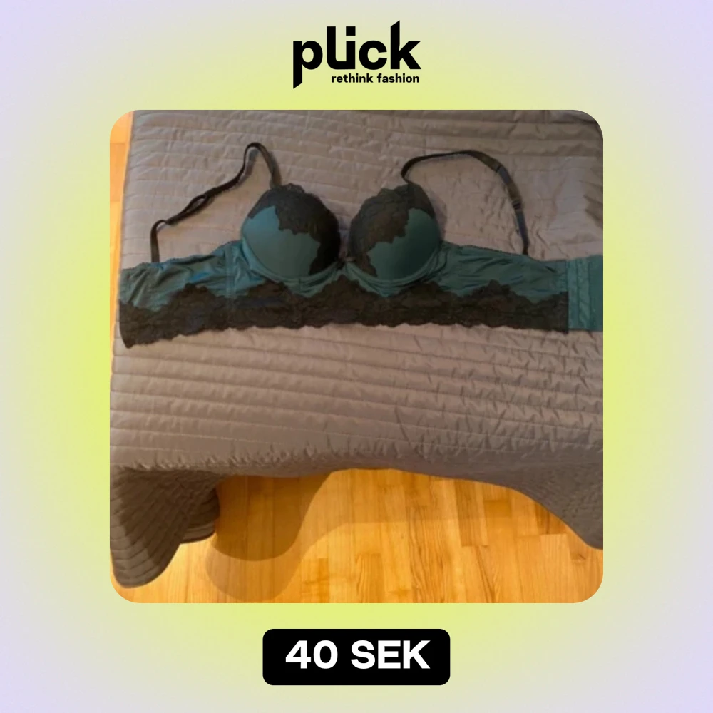 Mörkgrön lite längre bh, tyvärr är lappen bort klippt så jag vet ej vart den kommer ifårn eller storlek, men jag skulle tippa på att den är 65-70 A/B, lute sliten finns bilder i slutet, lite puch upp