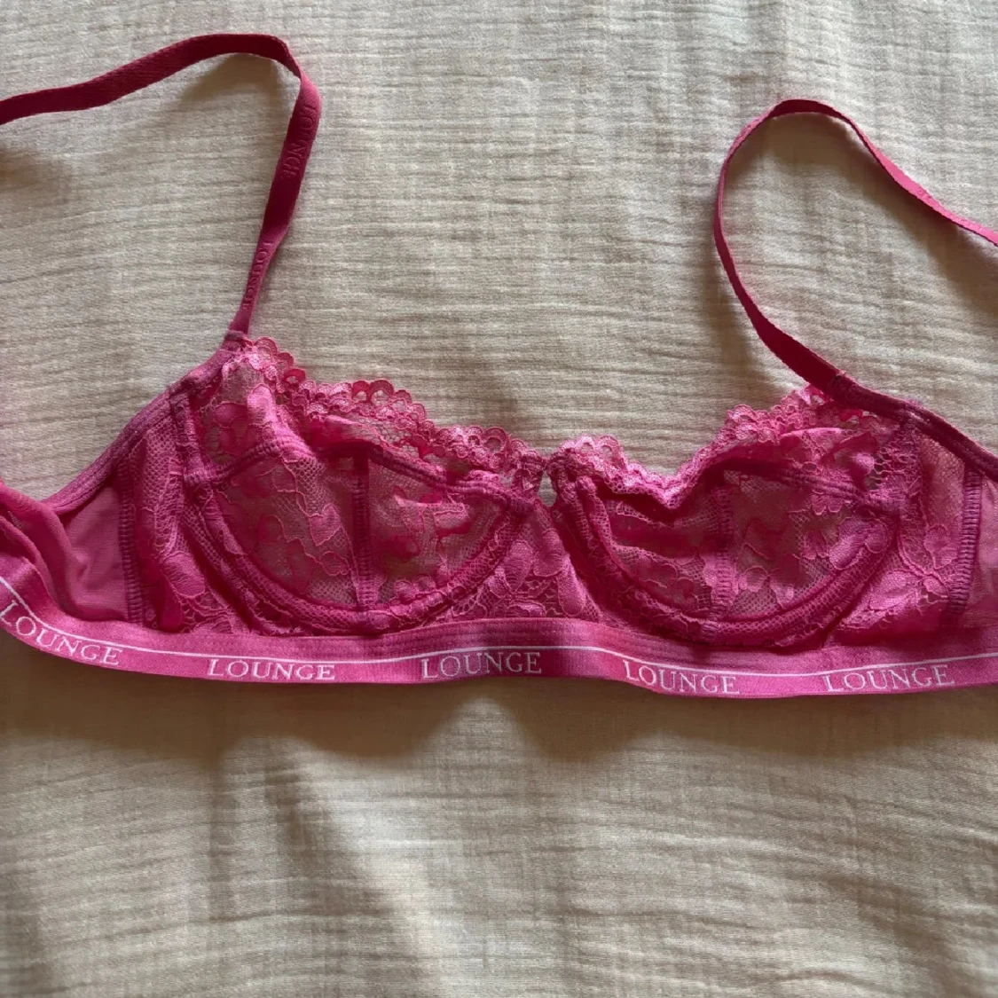 Säljer en snygg rosa bralette från Lounge med spetsdetaljer och tunna axelband. Underkanten har en elastisk resår med Lounge-loggan tryckt runtom. Perfekt för dig som gillar en feminin och bekväm stil. Liten u storleken så sitter mer som 70c typ💕