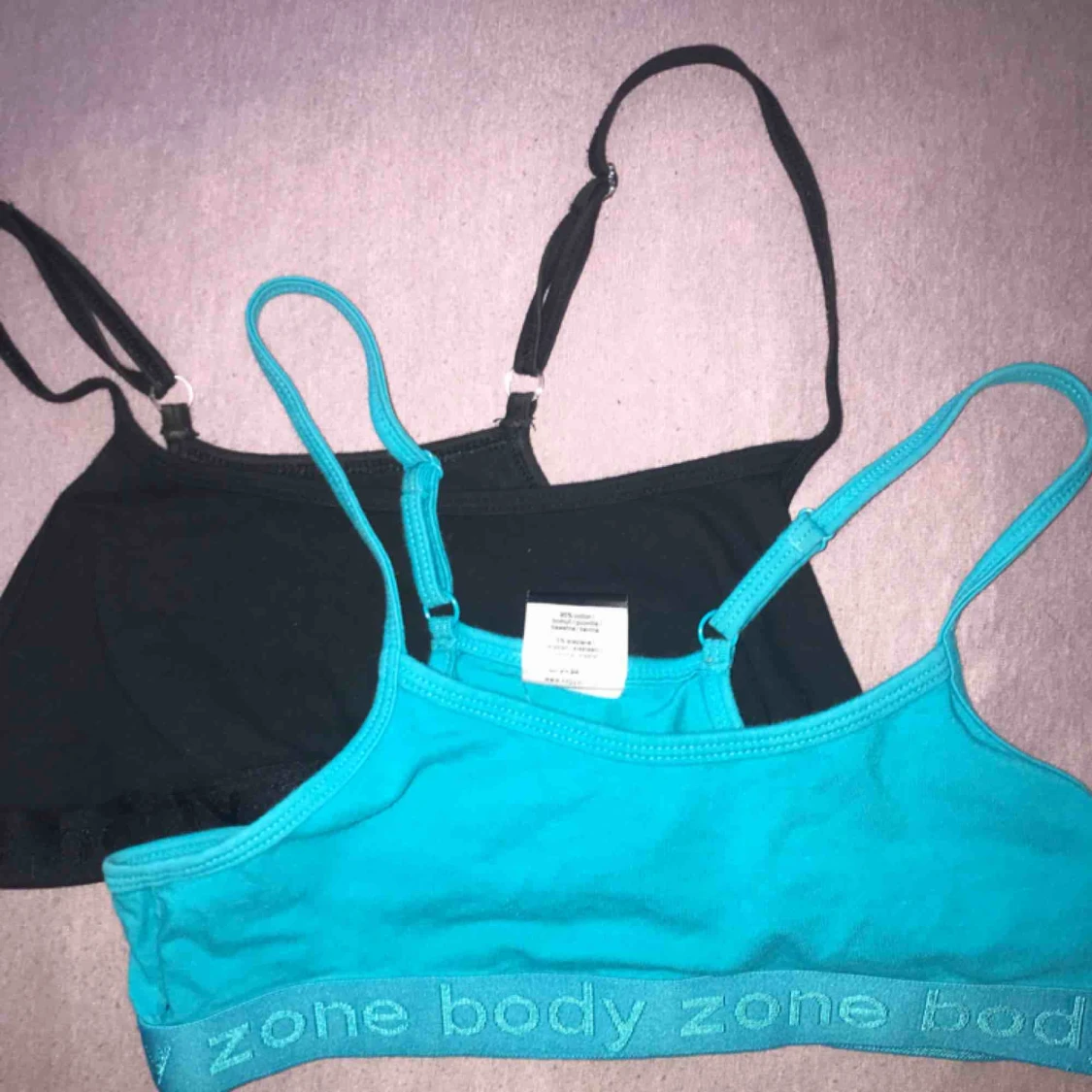 En svart och blå träningsbh! Finns även i rosa! Använda 2 gånger, väldigt skön material. 150kr var ;)