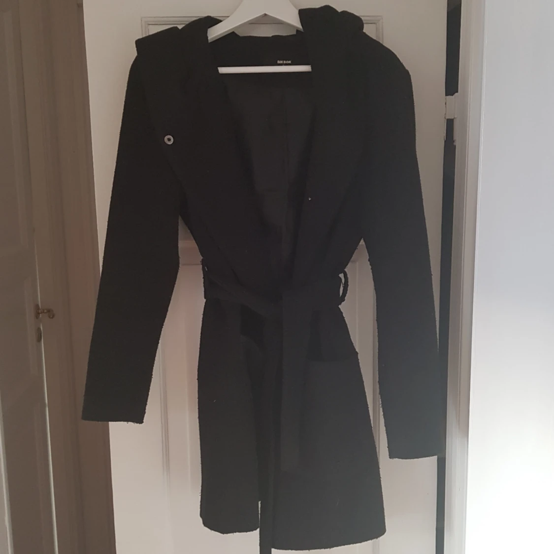 Jacka från BikBok, svart med skärp i midjan, två stora fickor framtill, stor luva, knäppa med dolda knappar, halvlång, för höst/vinter. Knäppt använd. Kostar 800 kr ny.