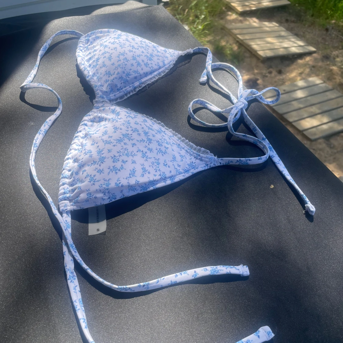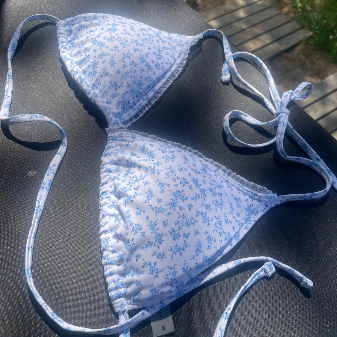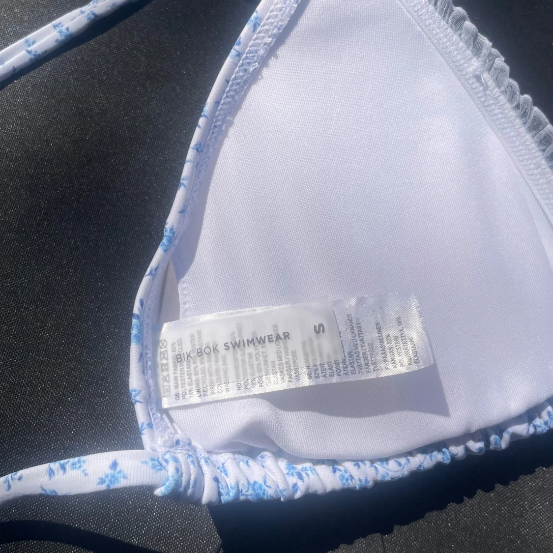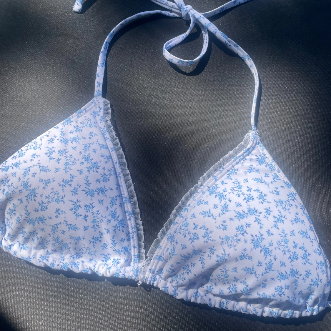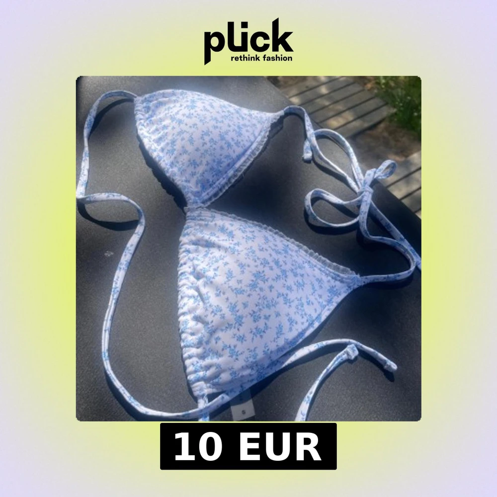 Supersöt trekantsbikini från Bik Bok med vitt tyg och småblommigt blått mönster. Knytband i nacken och ryggen för perfekt passform. Liten volangkant längs kuporna ger en extra gullig touch. Perfekt för strandhäng och soliga dagar!