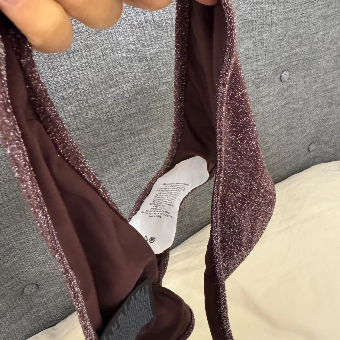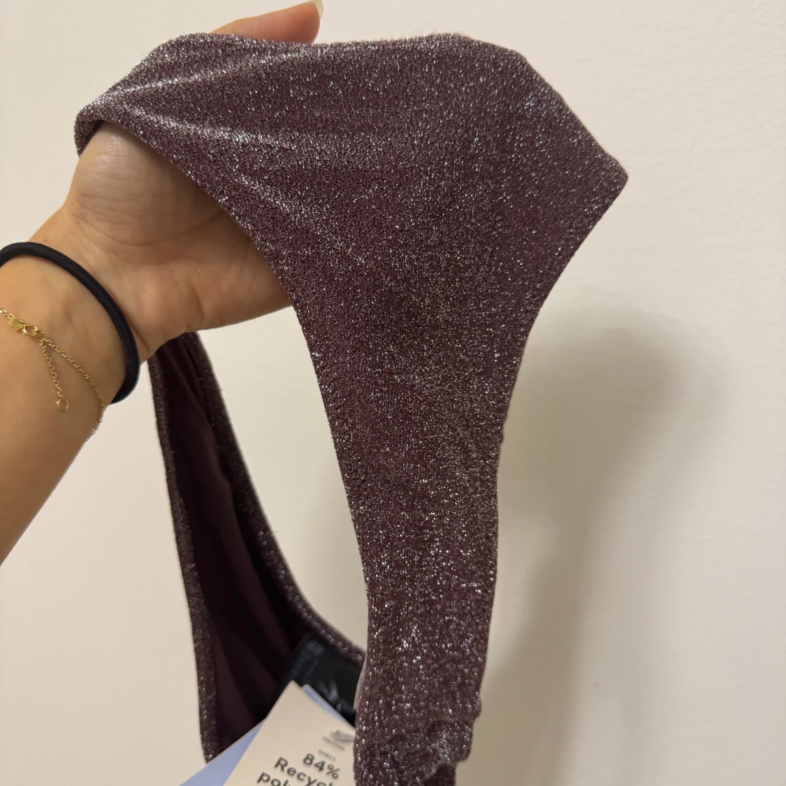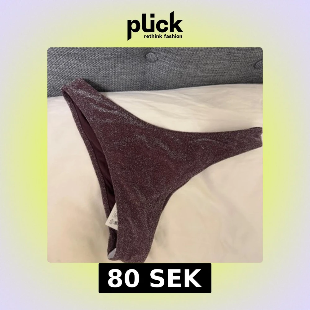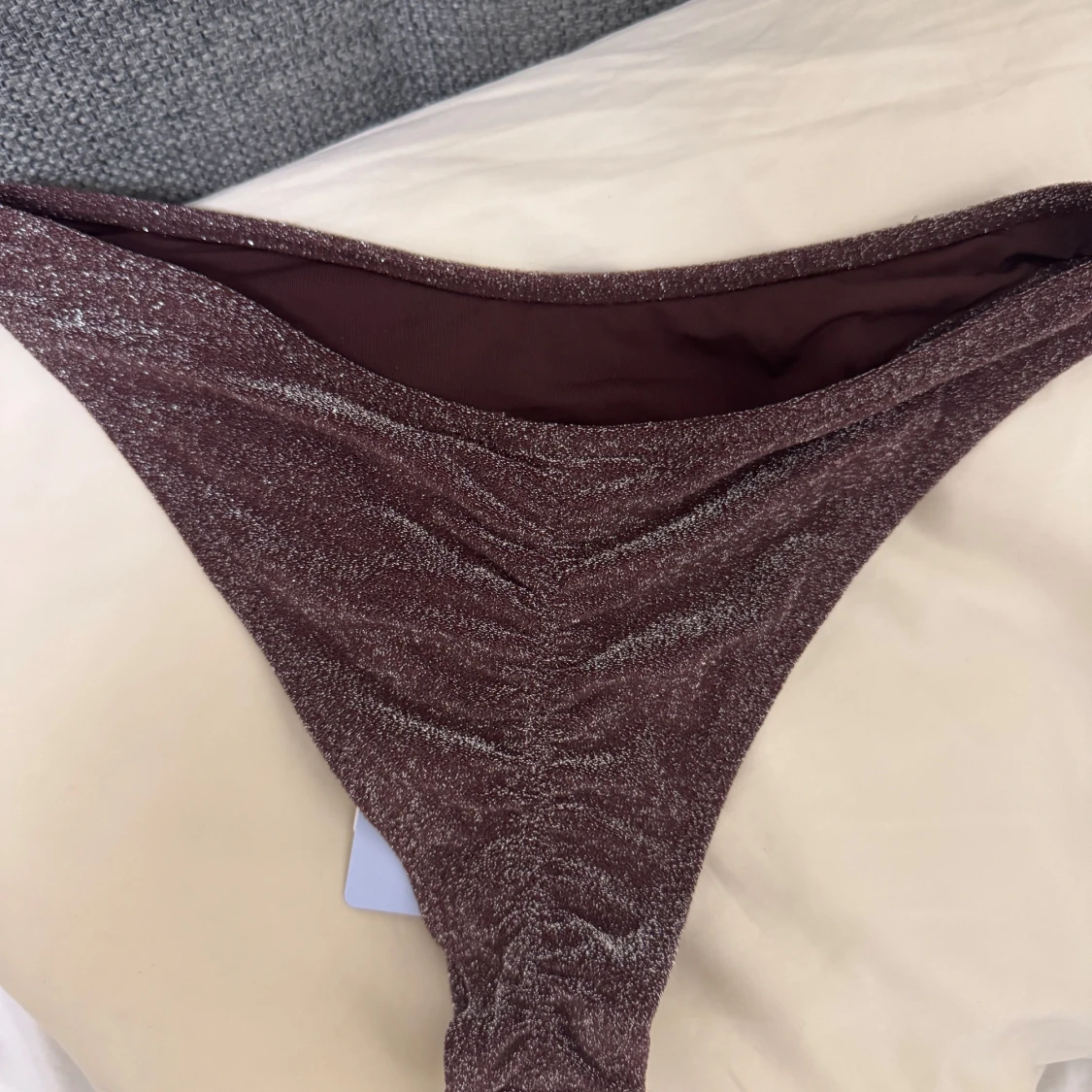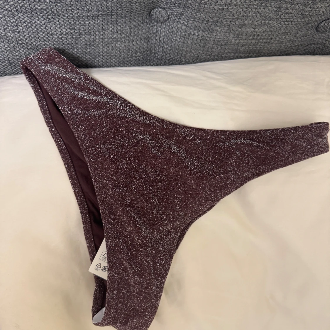 Supersnygg bikiniunderdel i vinröd färg med glittrigt tyg. Modellen har hög skärning och scrunch-detalj bak för en extra snygg passform. Storlek s och aldrig använt med prislapp
