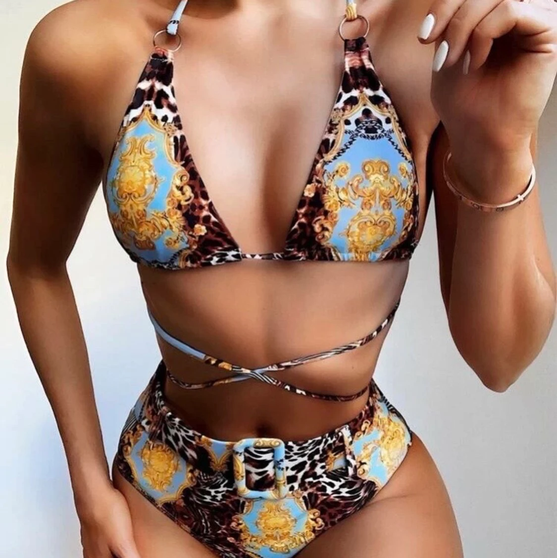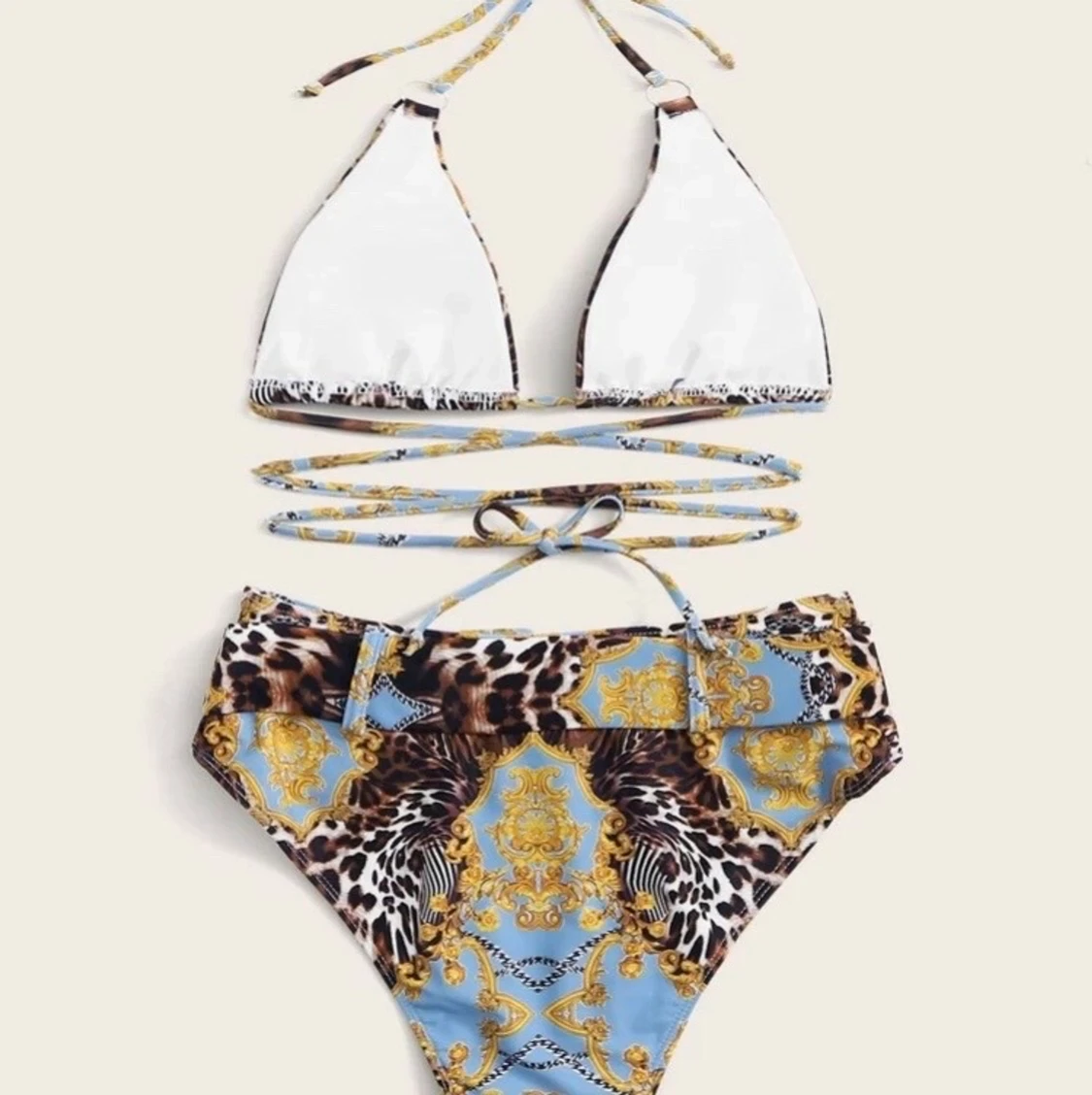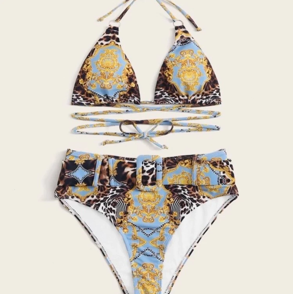 Mönstrad cool bikini med högmidjade trosor. Toppen har långa snören som man knyter runt kroppen som man vill. Oanvänt, endast testad. Har en till i samma mönster så man kan matcha de olika delarna med varandra. Buda