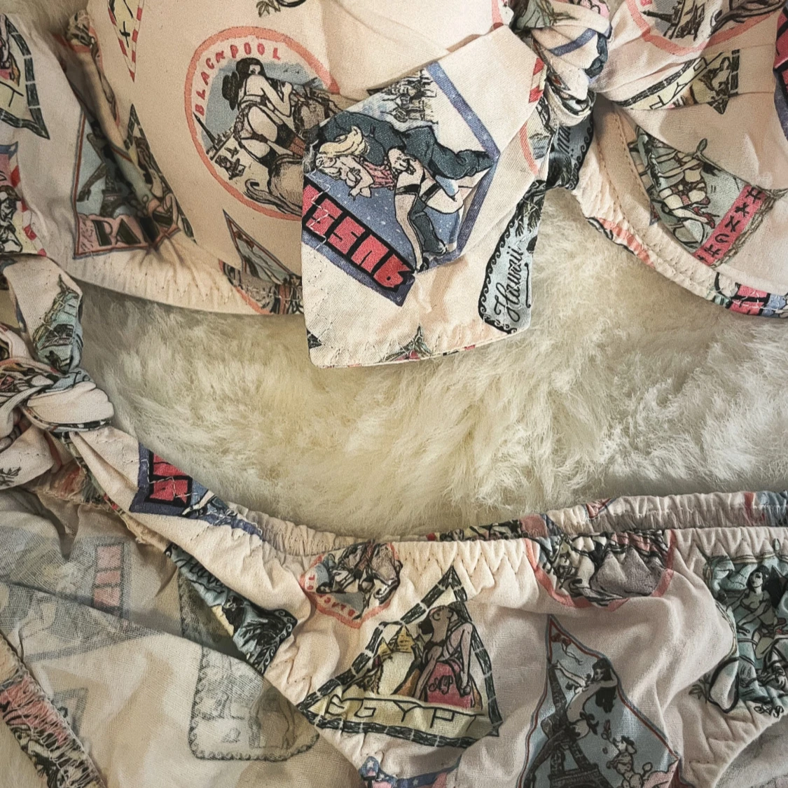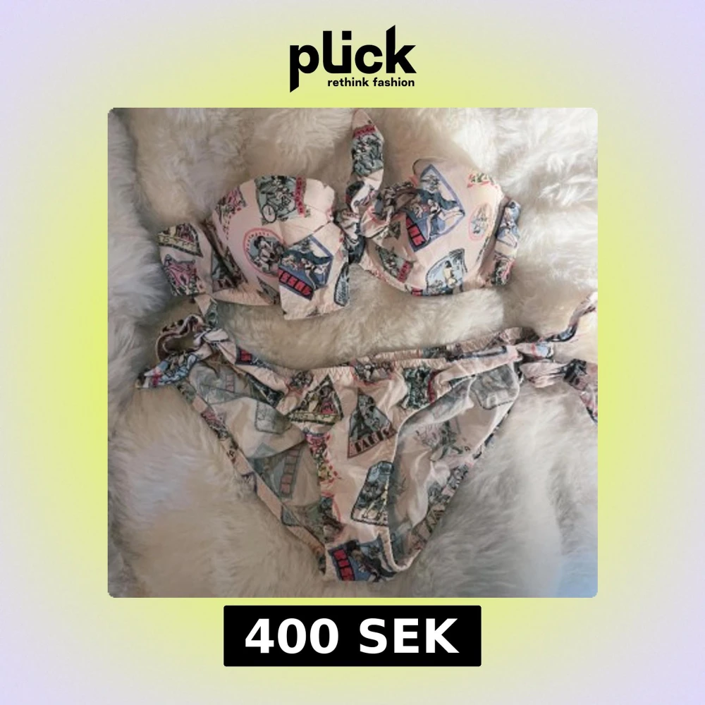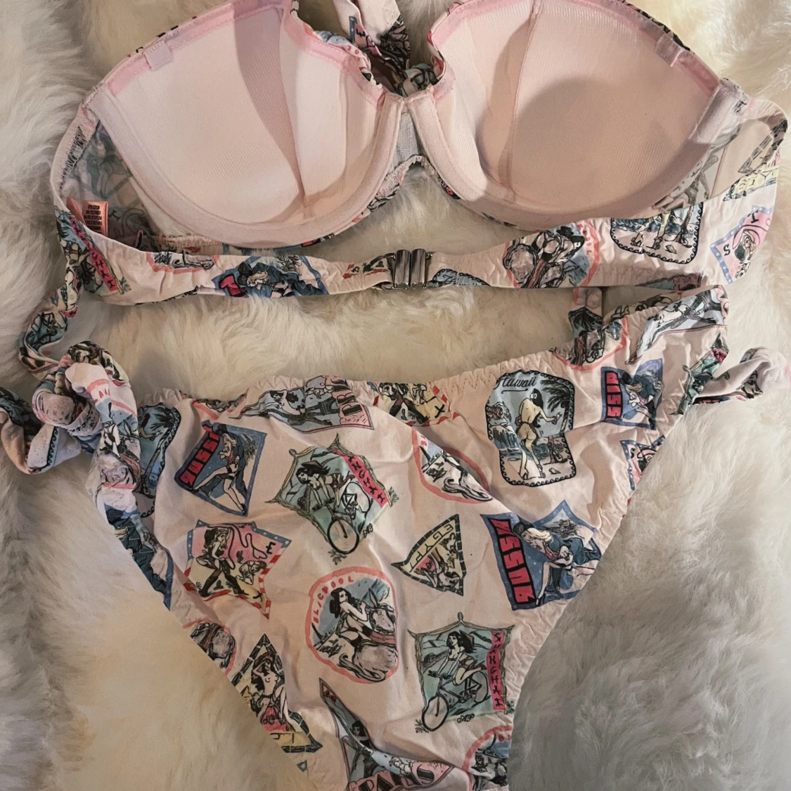 Superfin bikini / underklädesset från Agent Provocateur med unikt retroinspirerat print i pastellrosa, blått och grönt. Setet har knyt både på toppen och trosorna, aldrig använd💕toppen är 75a och trosorna strl 1
