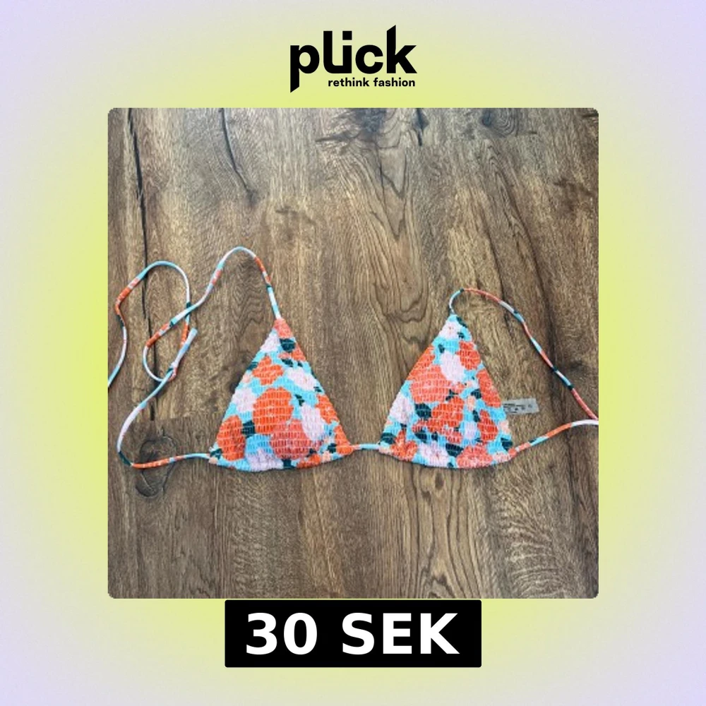 Säljer en färgglad trekantsbikini med blommigt mönster i orange, rött, blått och vitt. Bikinin har tunna knytband i sidorna och runt nacken, perfekt för sommardagar på stranden.