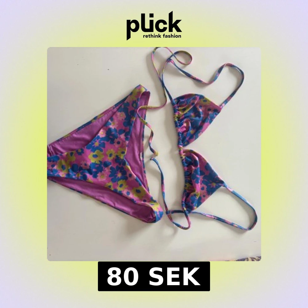 Snygg bikini med blommigt mönster i starka färger som rosa, blått och gult. Toppen är trekantsmodell med smala snören att knyta i nacken och ryggen. Underdelen har klassisk form och samma färgglada blommor. Perfekt för stranden eller poolen i sommar!