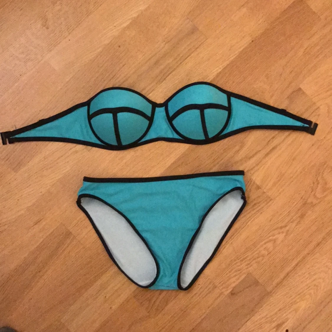 A blue triangle bandeau bikini. New, never used. Comes with removable and reattach-able straps. Feel free to ask any questions. En blå bikini som var aldrig använd, helt ny. Kommer med axelband som man kan ta av och sätta på igen. Tveka inte att ställa frågor.
