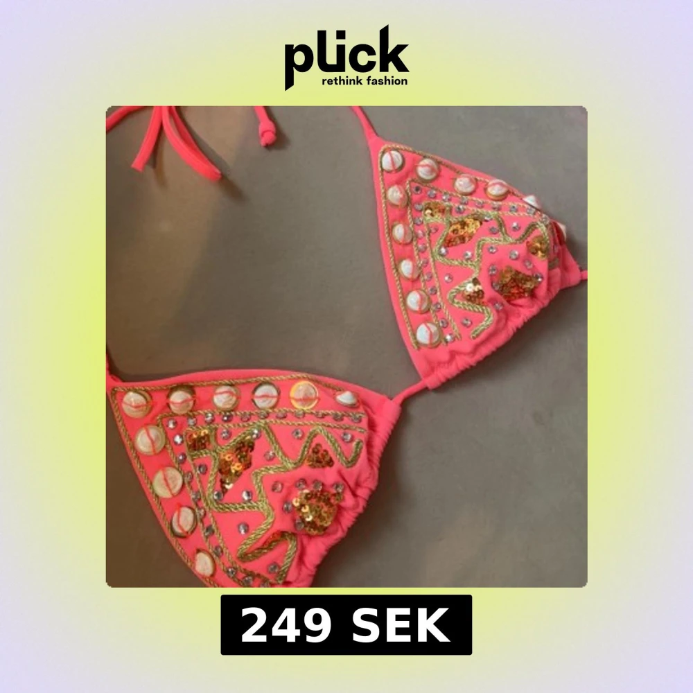 Superfin trekantsbikini i starkt rosa/lite orange med guldiga paljetter, snäckor och glittriga stenar. Bikinin har knyt i nacken och ryggen samt dekorativa broderier och snörning. SJUKT SNYGG. Säljer då den tyvärr är för liten.