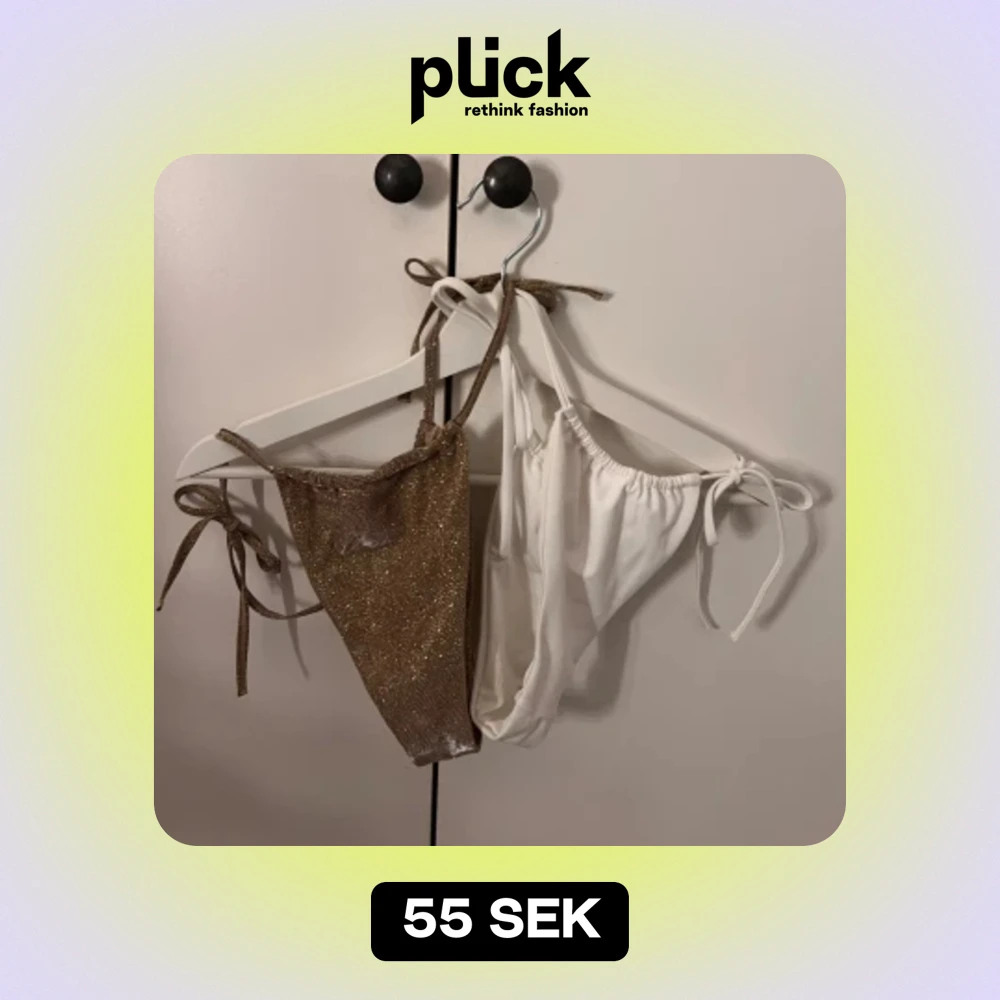 Säljer oanvända bikini trosor från bikbok. Den vita är i storlek xs och den guldiga i storlek s. Trosorna kostar 20kr styck. För mer frågor är det bara att höra av sig💕☀️