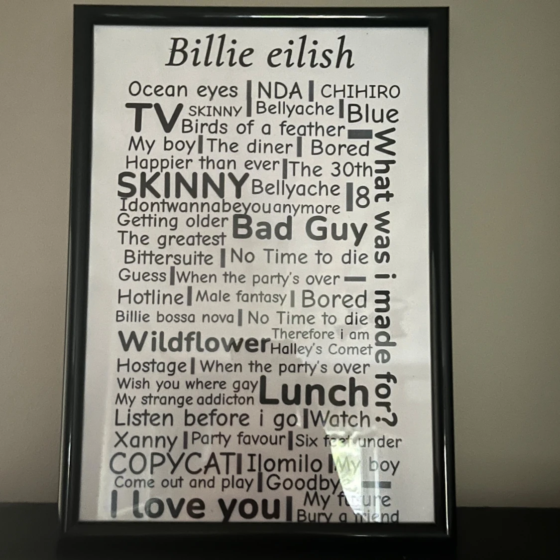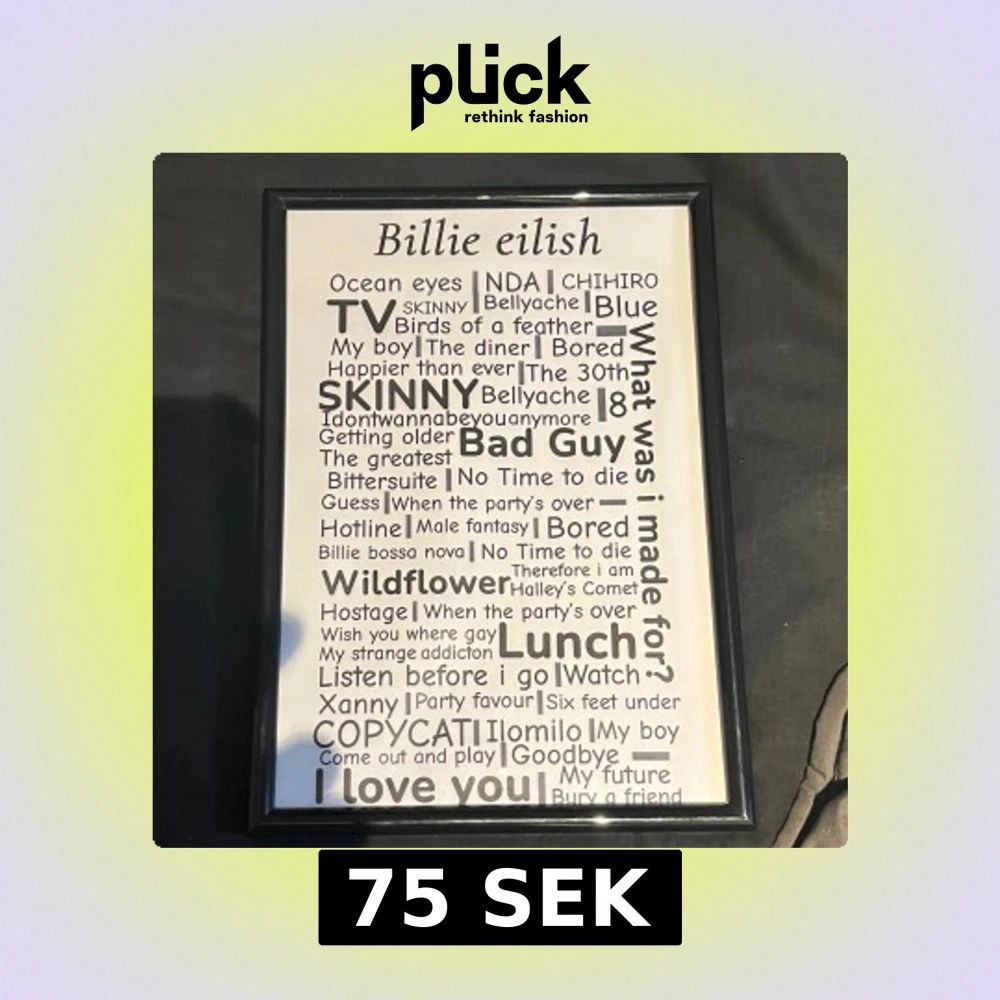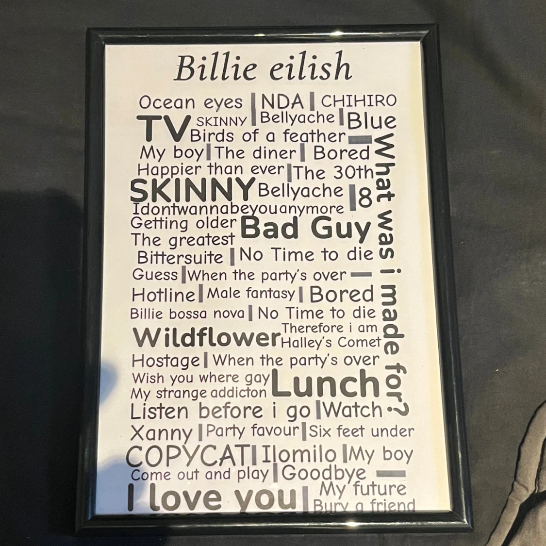 En egendesignad Billie eilish affisch med hennes bästa låtar! Kommer endast att göra ett begränsat antal så först till kvarn gäller.
