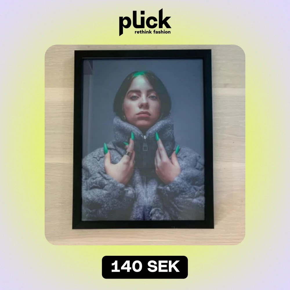 Billie Eilish poster (ramen ingår) i nyskick. Cirka 33x43cm med ram. (Mitt tag speglar sig i glaset, den är inte randig). Hör av er vid minsta frågor.